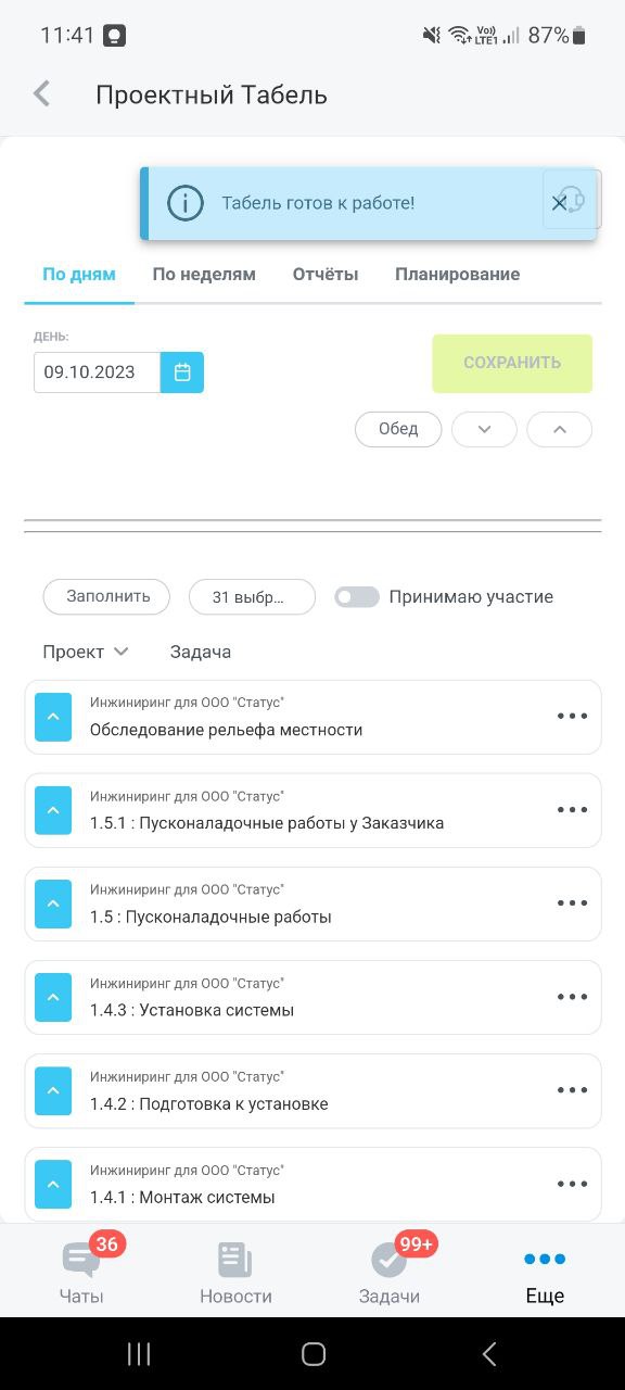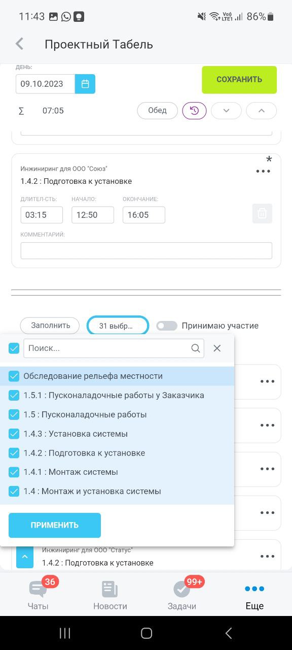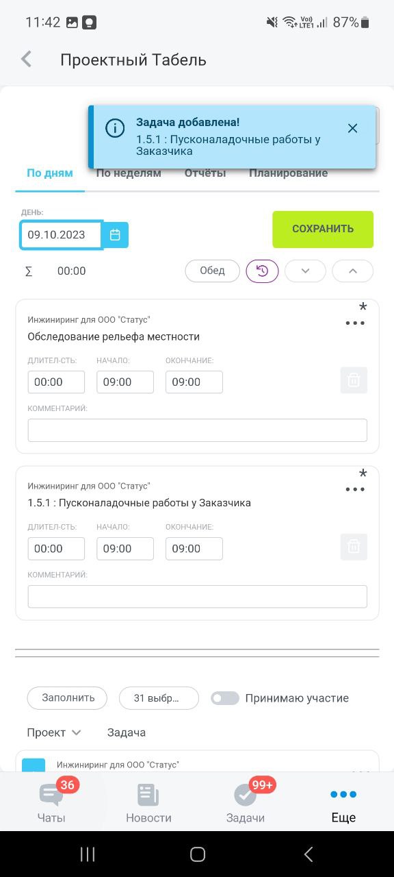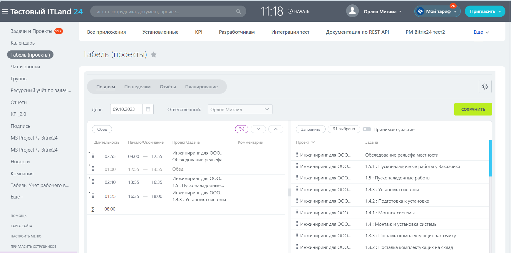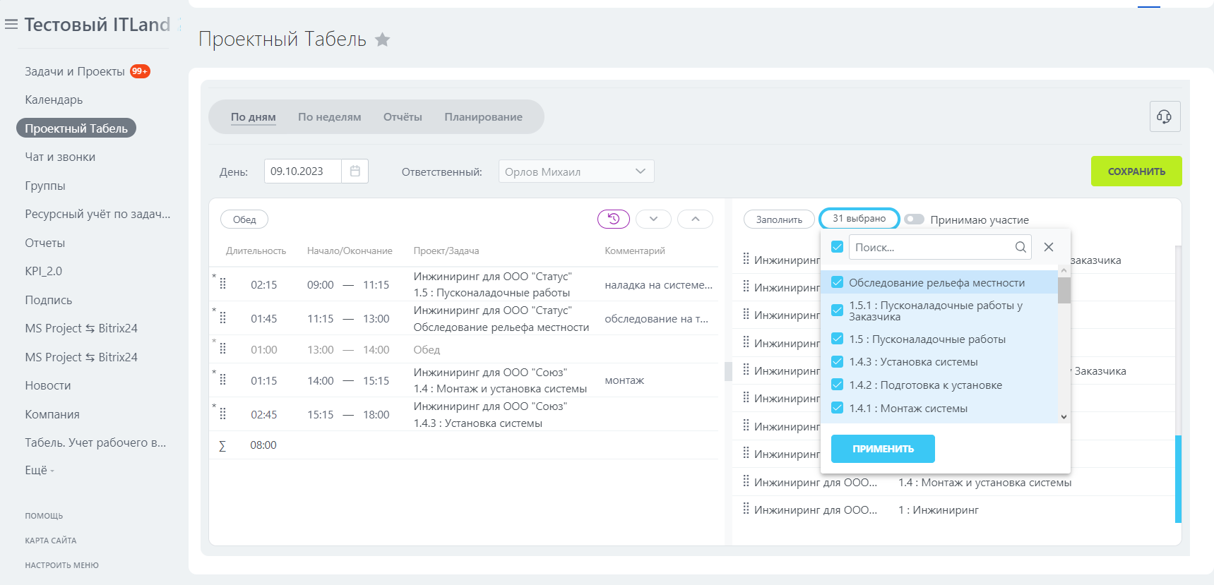 - Удобный Drag-and-drop задач в Табель в едином окне и лёгкое назначение времени;