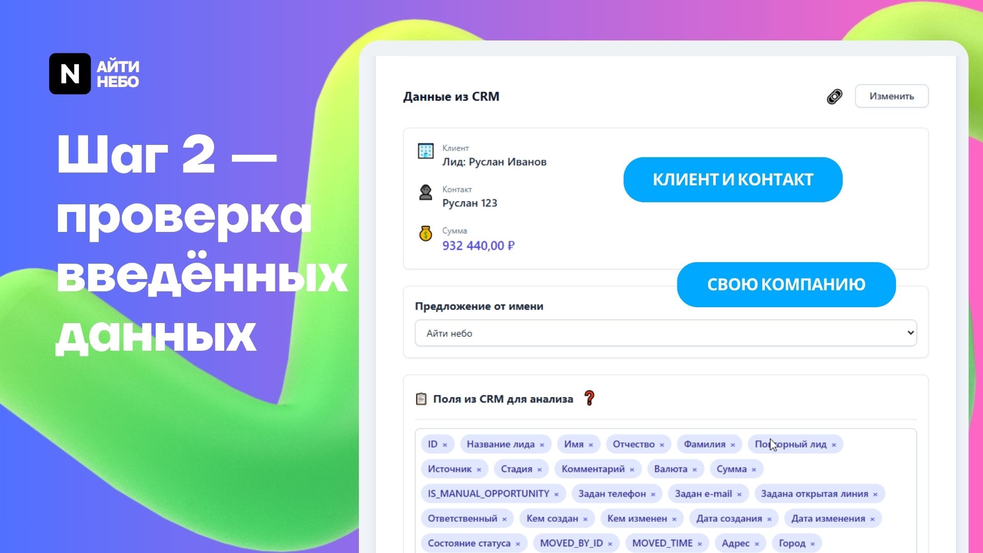 Гибкий выбор данных: Вы можете вручную выбрать, какие поля из карточки CRM должен проанализировать искусственный интеллект для максимальной персонализации.