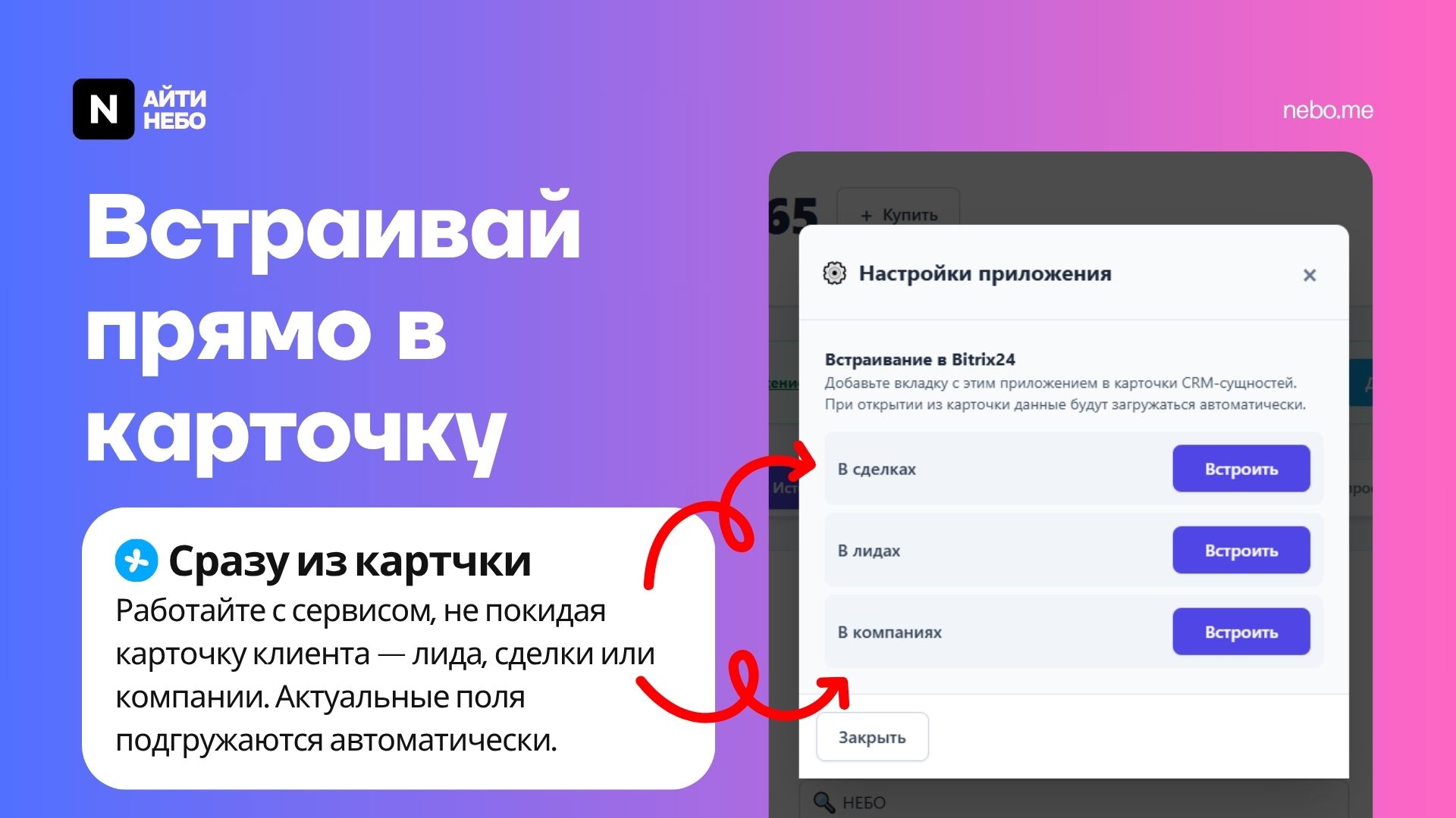 Встройте приложение как отдельную вкладку в карточки сделок, лидов и компаний. Работайте с сервисом, не покидая привычного интерфейса — все актуальные данные подгрузятся автоматически при открытии вкладки.