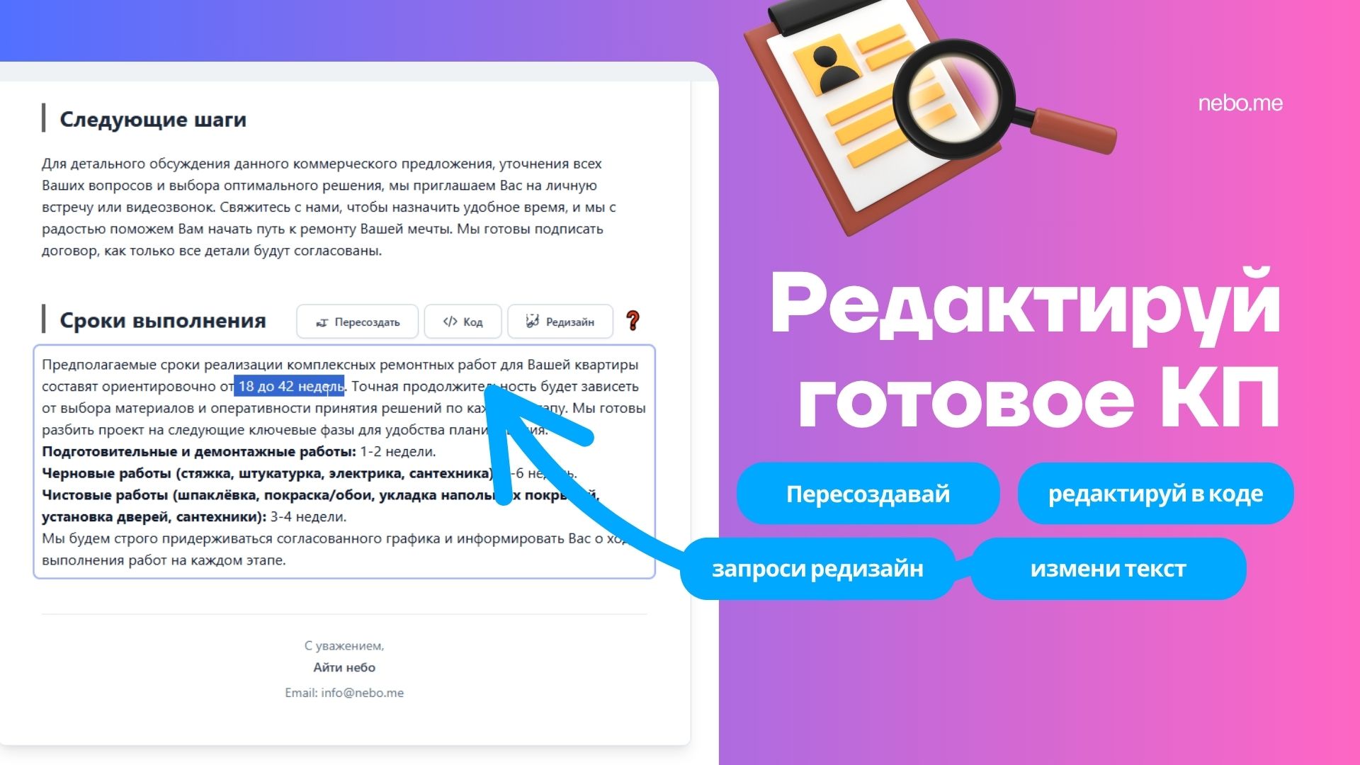 Мгновенная генерация: AI обрабатывает всю информацию и создает готовое коммерческое предложение на основе вашего шаблона.