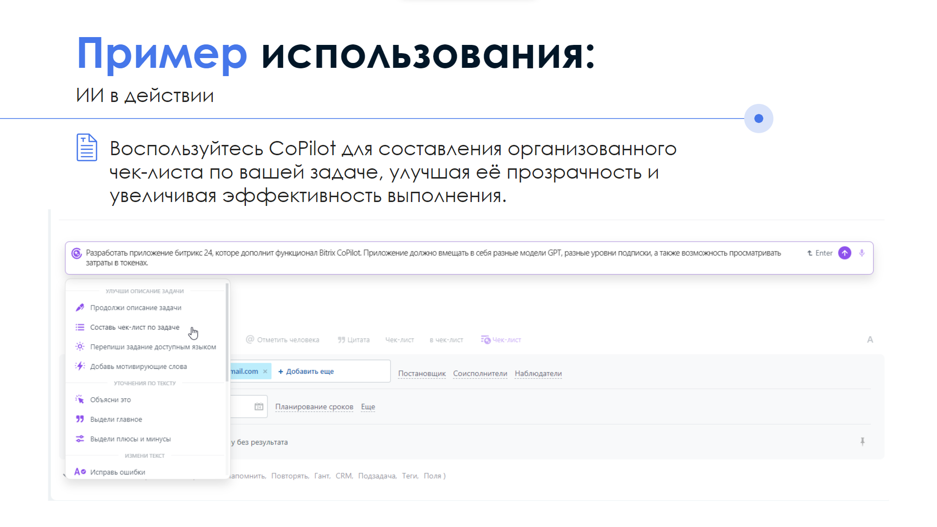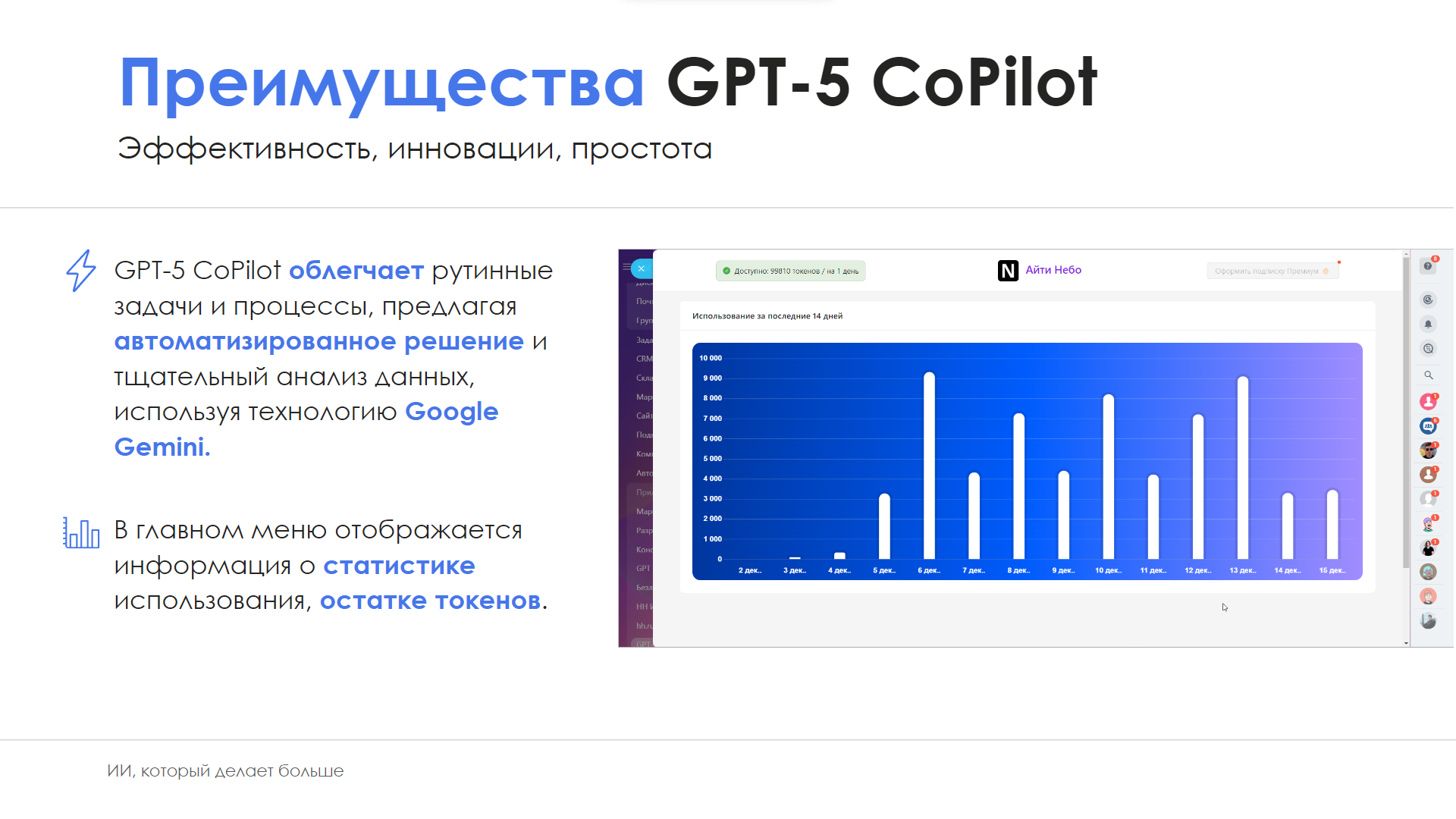 GPT-5 CoPilot трансформирует ваш Битрикс24, привнося в него мощь ИИ от Google, чтобы каждая задача была выполнена быстрее, точнее и эффективнее, поднимая ваш бизнес-процесс на новый уровень продуктивности и инноваций.