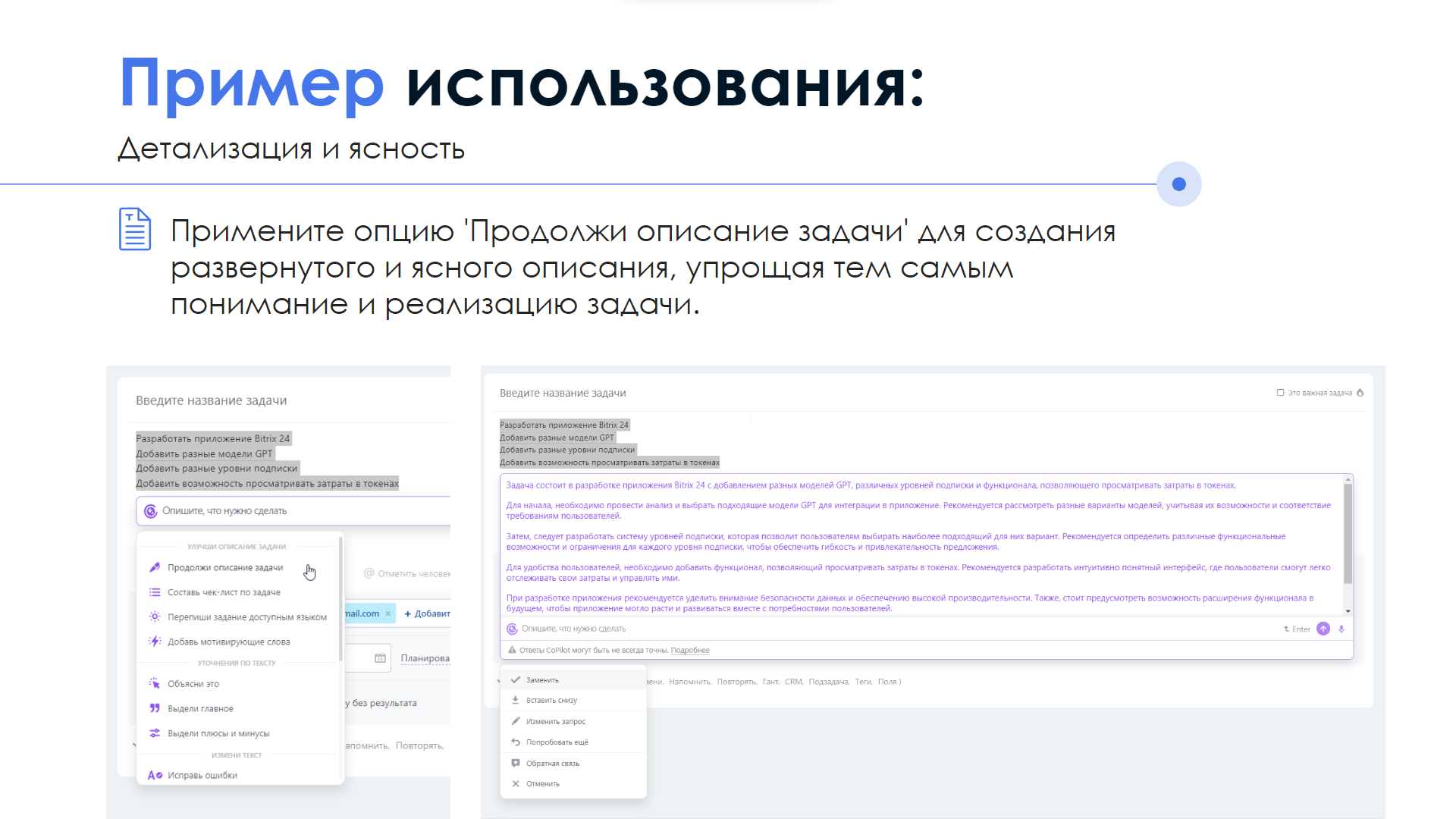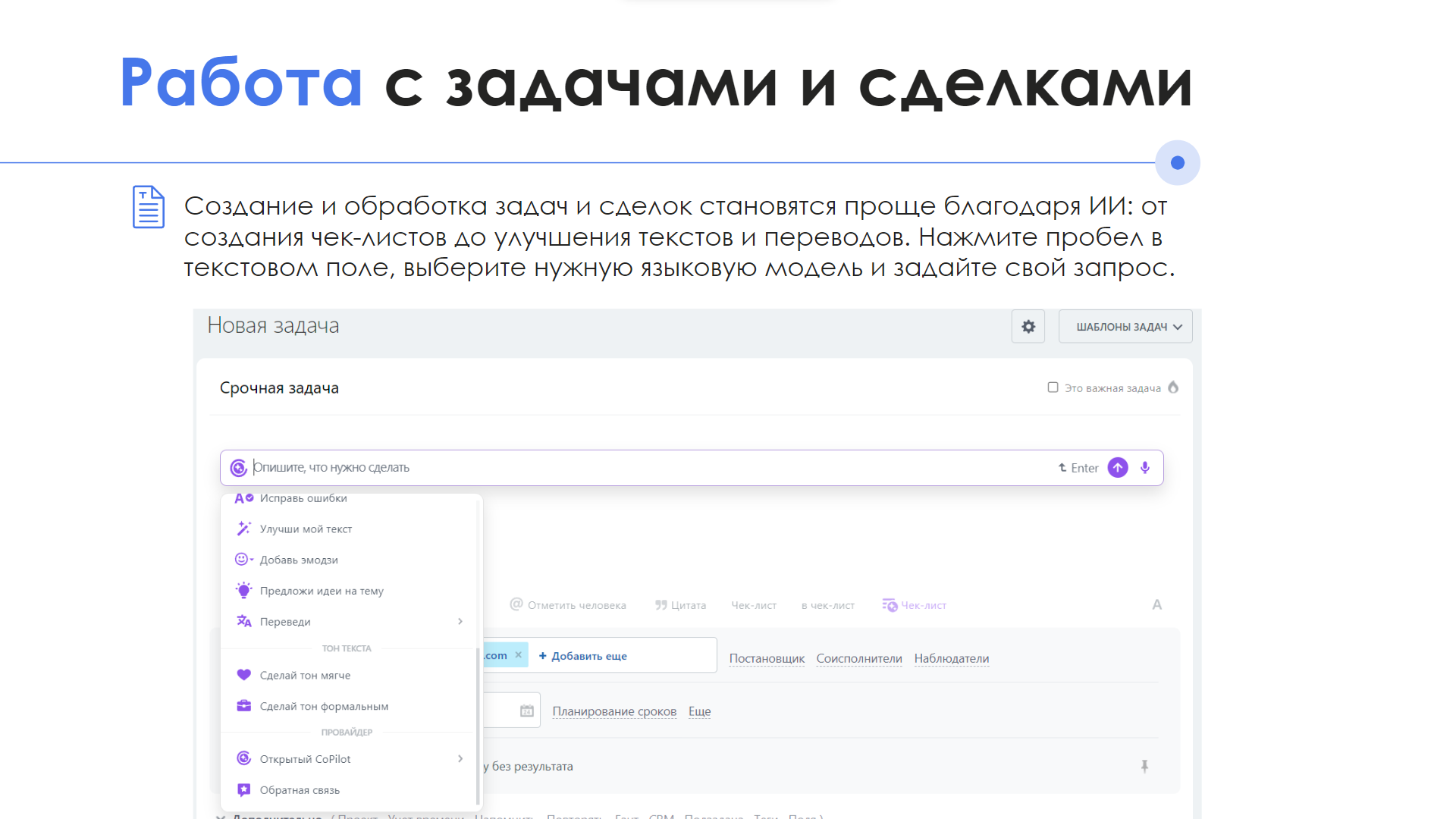 - Задачи и Сделки: Используйте ИИ для создания, обработки и улучшения текстов задач и сделок. Введите запрос в текстовое поле, выберите подходящую модель и направление работы.