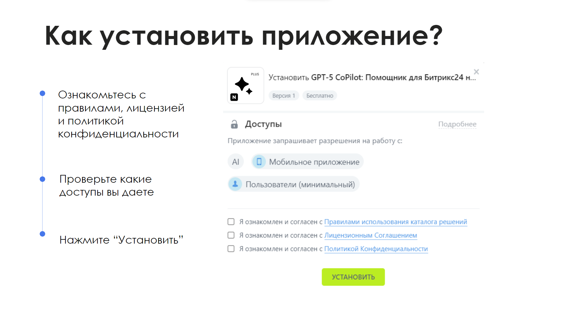 GPT-5 CoPilot для Битрикс24 представляет собой высокотехнологичный инструмент, который интегрирует возможности Google Gemini Pro для оптимизации рабочих процессов. Это приложение предлагает мощные ИИ-инструменты для автоматизации, аналитики и улучшения взаимодействия, делая каждую задачу более эффективной и менее времязатратной.