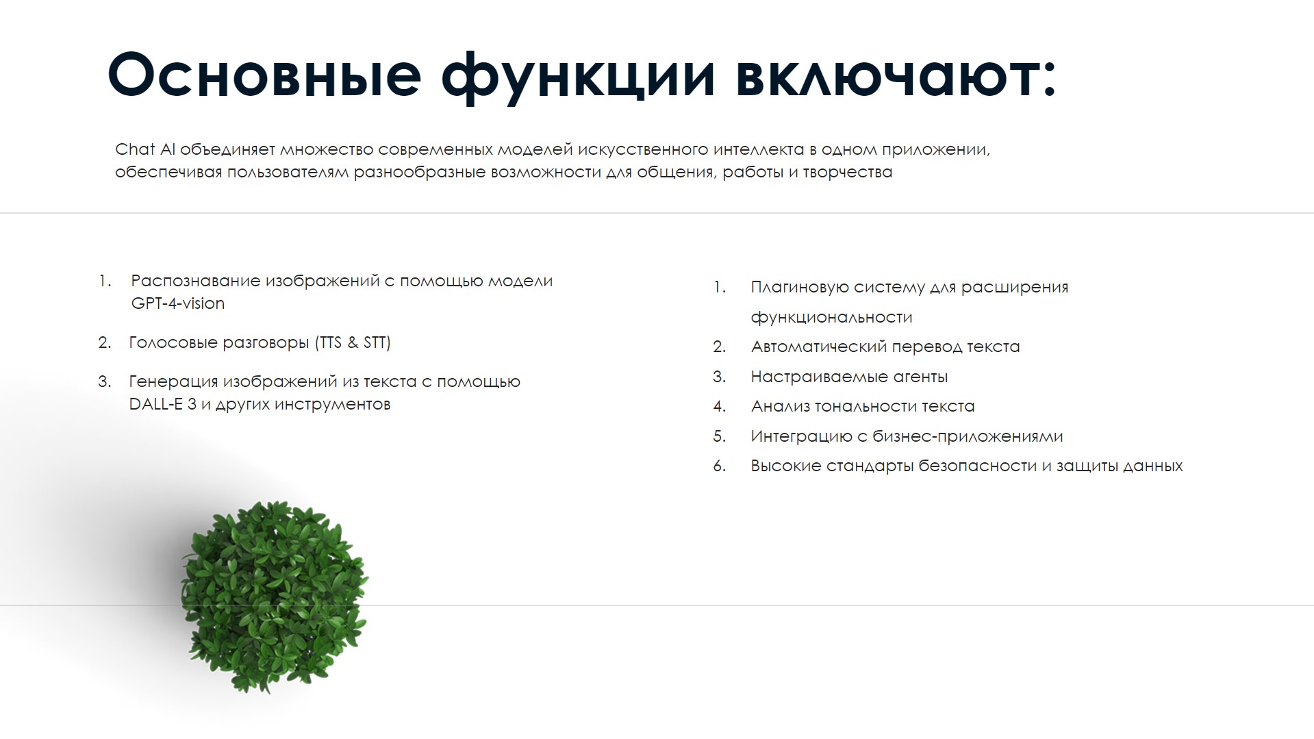 Chat AI объединяет множество современных моделей искусственного интеллекта в одном приложении, обеспечивая пользователям разнообразные возможности для общения, работы и творчества.