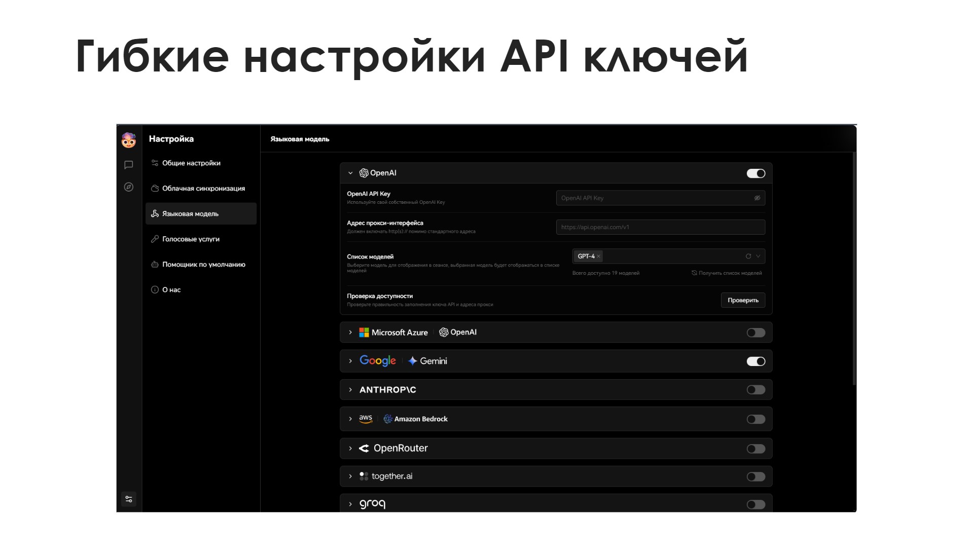 Основное преимущество приложения в том, что вы можете использовать любую модель ИИ с помощью своего API ключа.