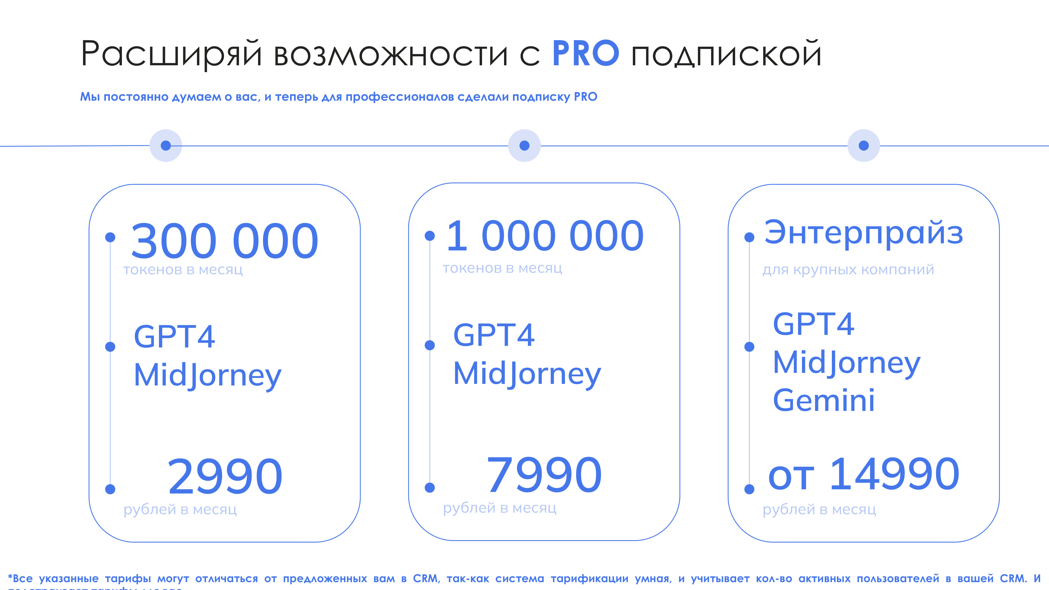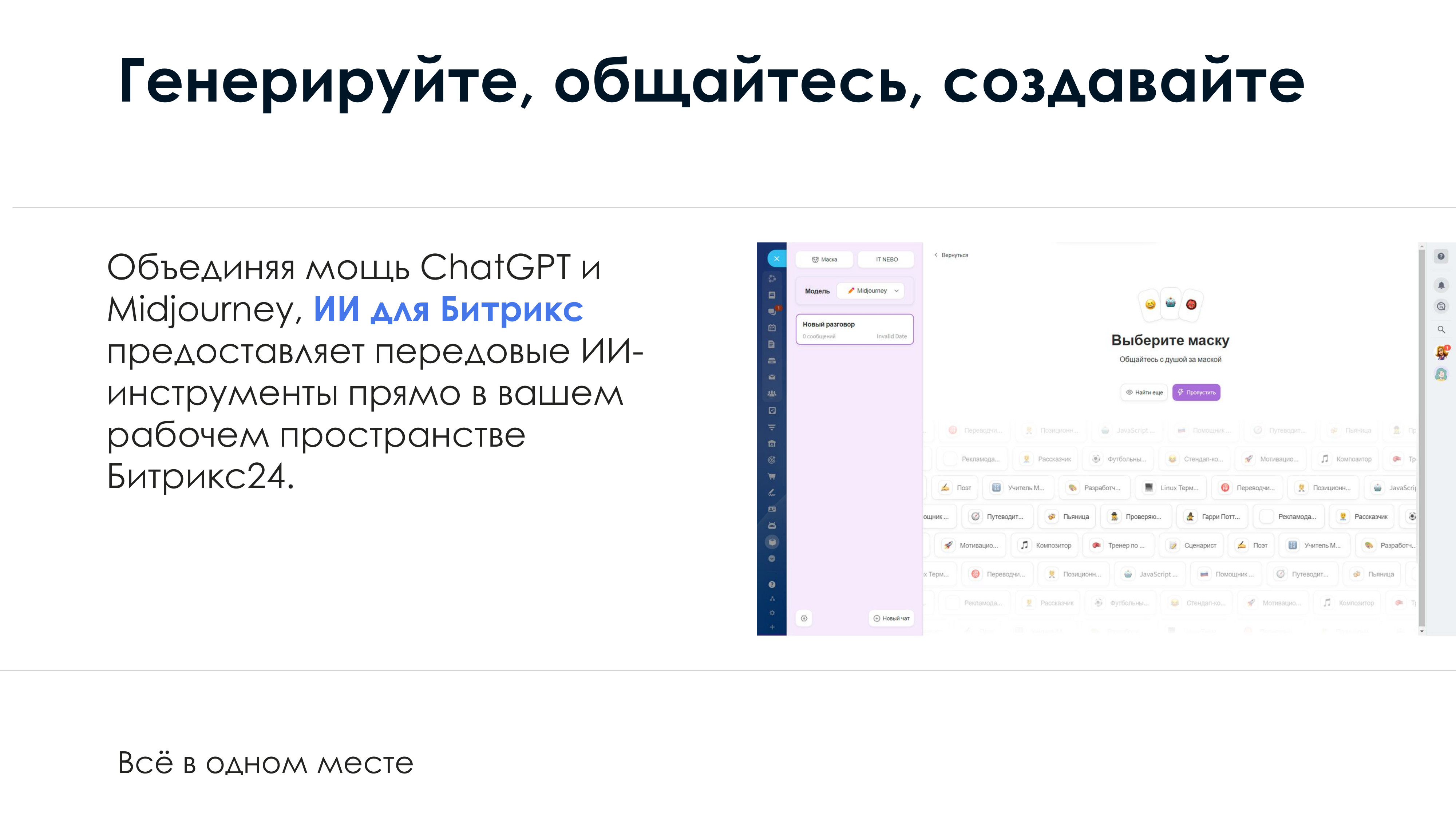 Революционное приложение для Битрикс24, которое объединяет сразу множество моделей ИИ. GPT-4 Turbo, GPT-3.5 Turbo, Midjorney и мы постоянно расширяем модельный ряд.