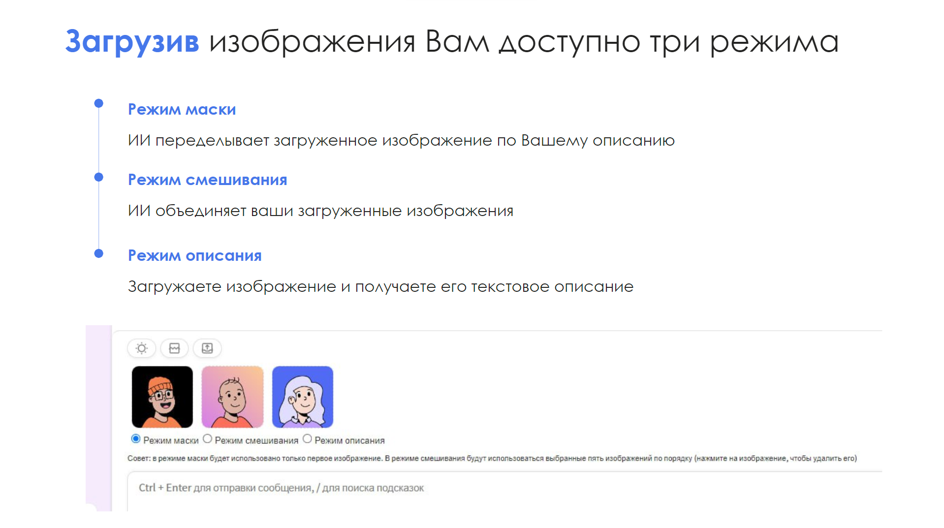 - Режимы Работы: Переключайтесь между режимами маски, смешивания и описания для различных задач.