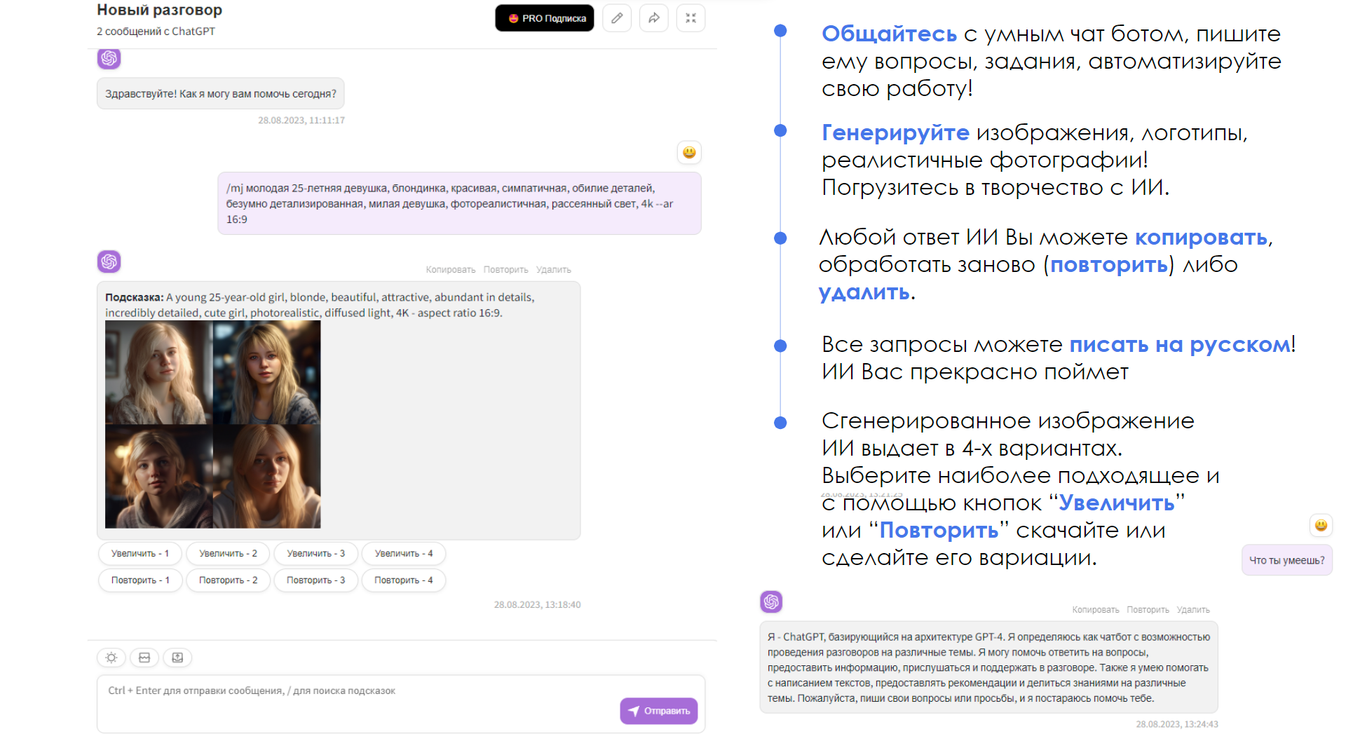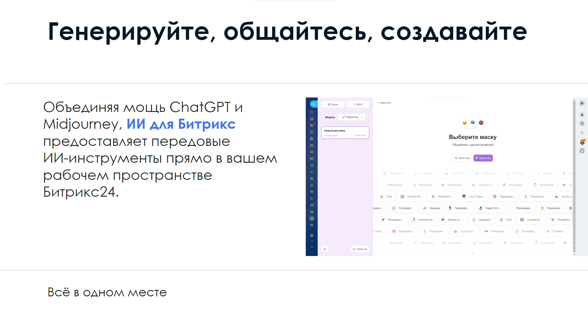 - Двойная мощь: Общайтесь с GPT для текстов и Midjourney для изображений.