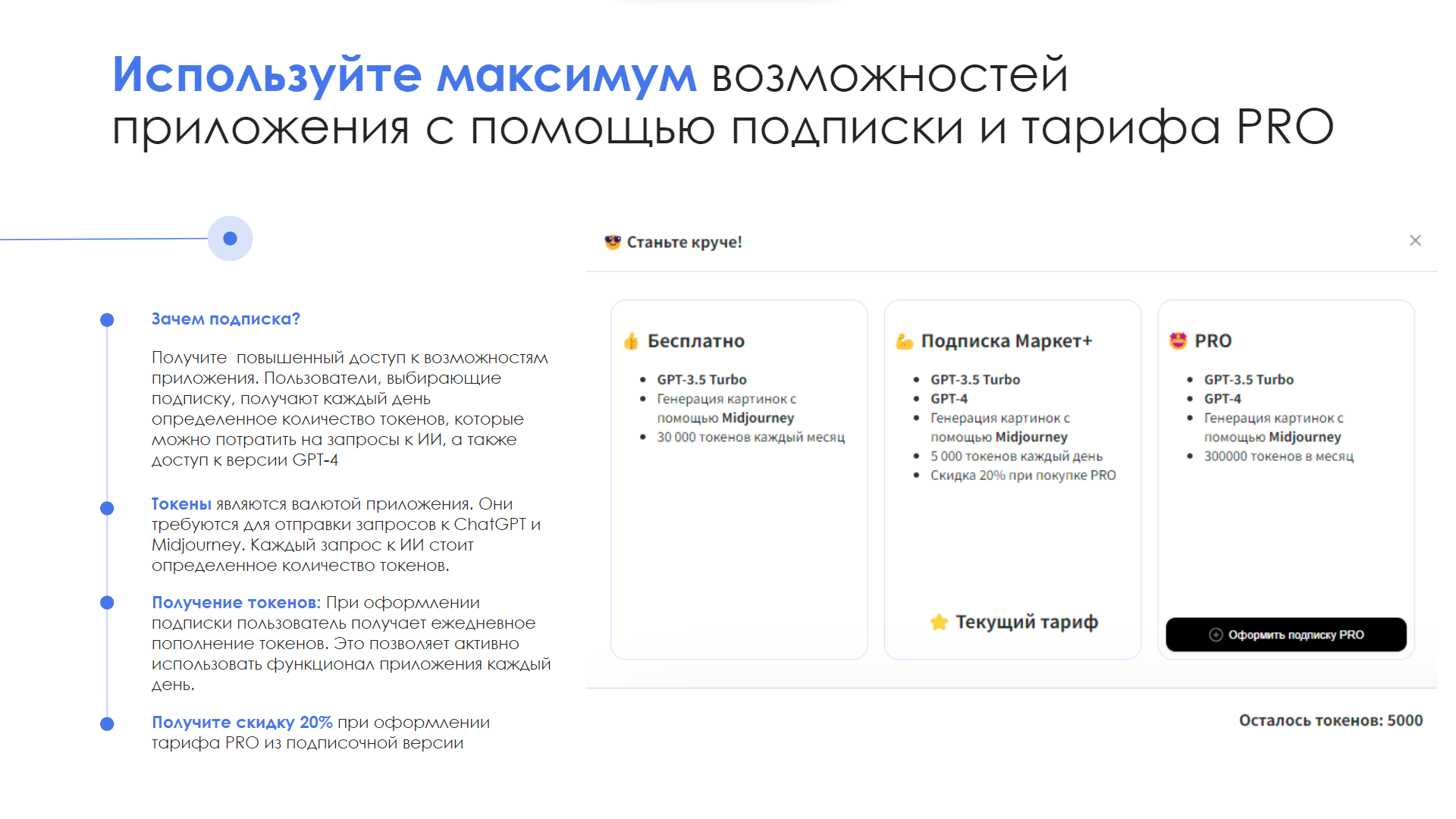 - Гибкая система токенов: Подстройте использование под ваш бюджет и потребности.