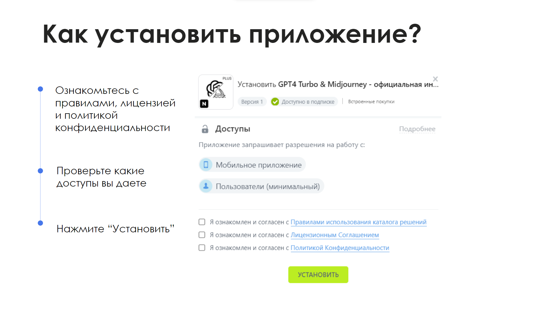 - Следуйте шагам установки в Битрикс24, согласитесь с правилами и предоставьте доступы.