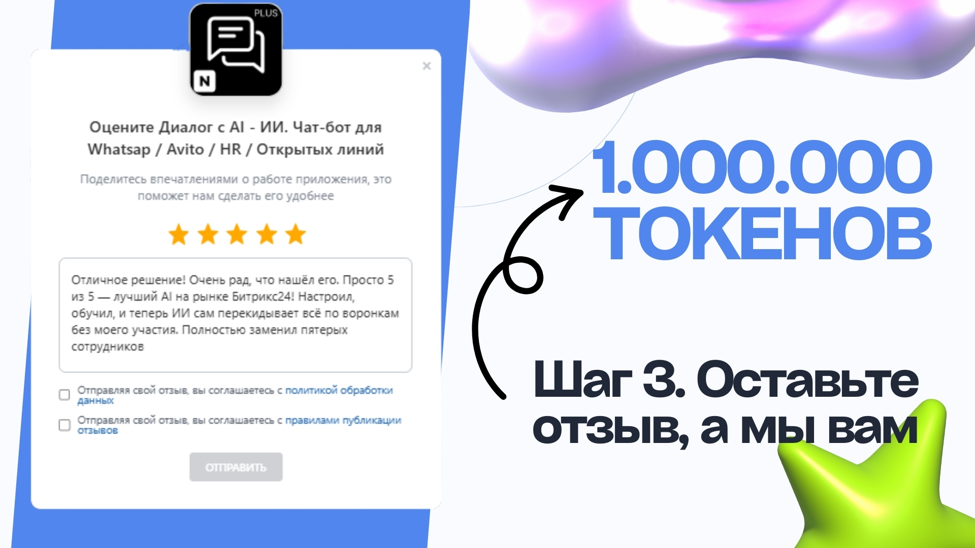 - Оставьте отзыв и получите 1млн токенов бесплатно