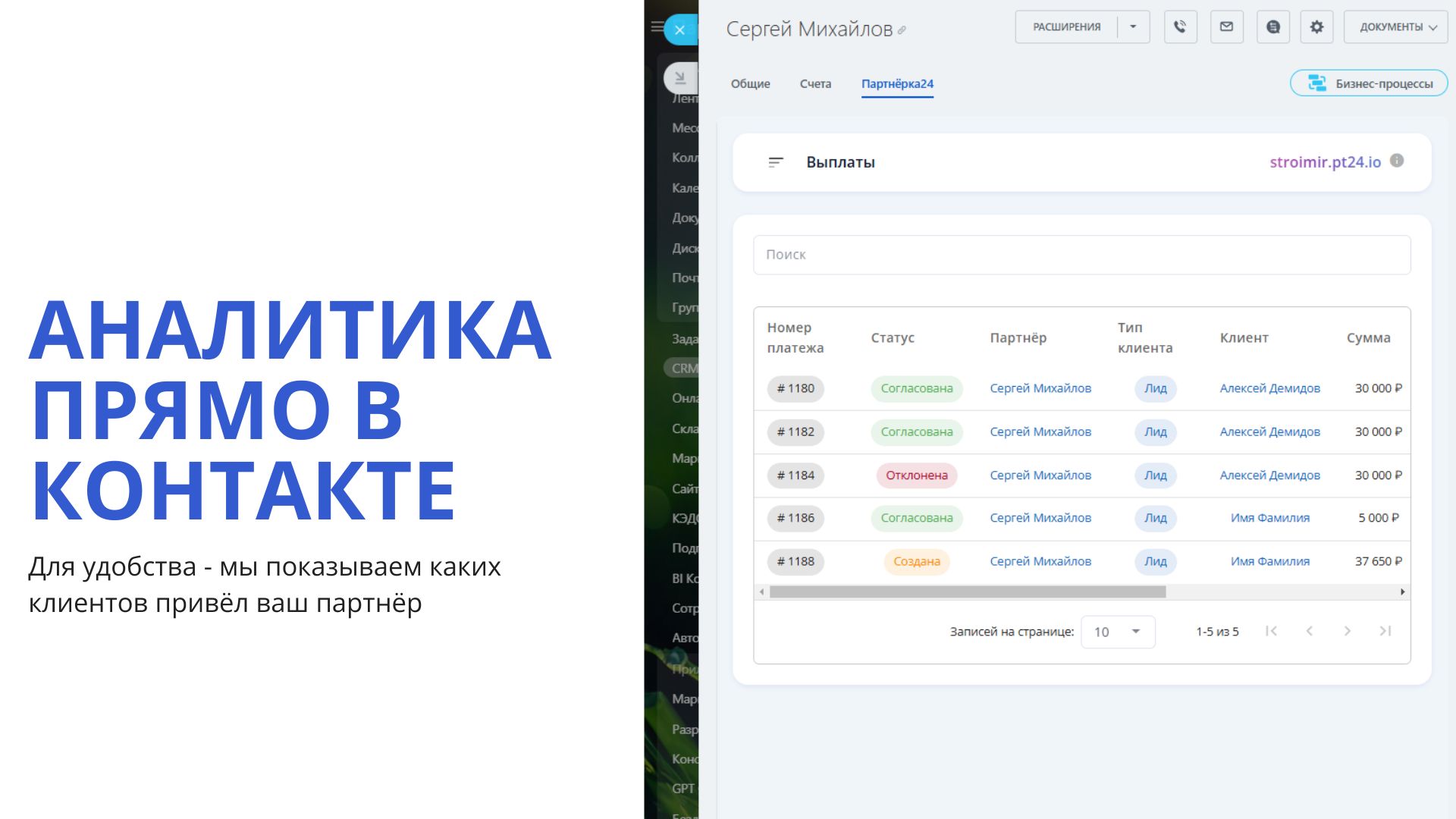 - Индивидуальный анализ: Возможность просматривать клиентов определённого партнёра из контакта.