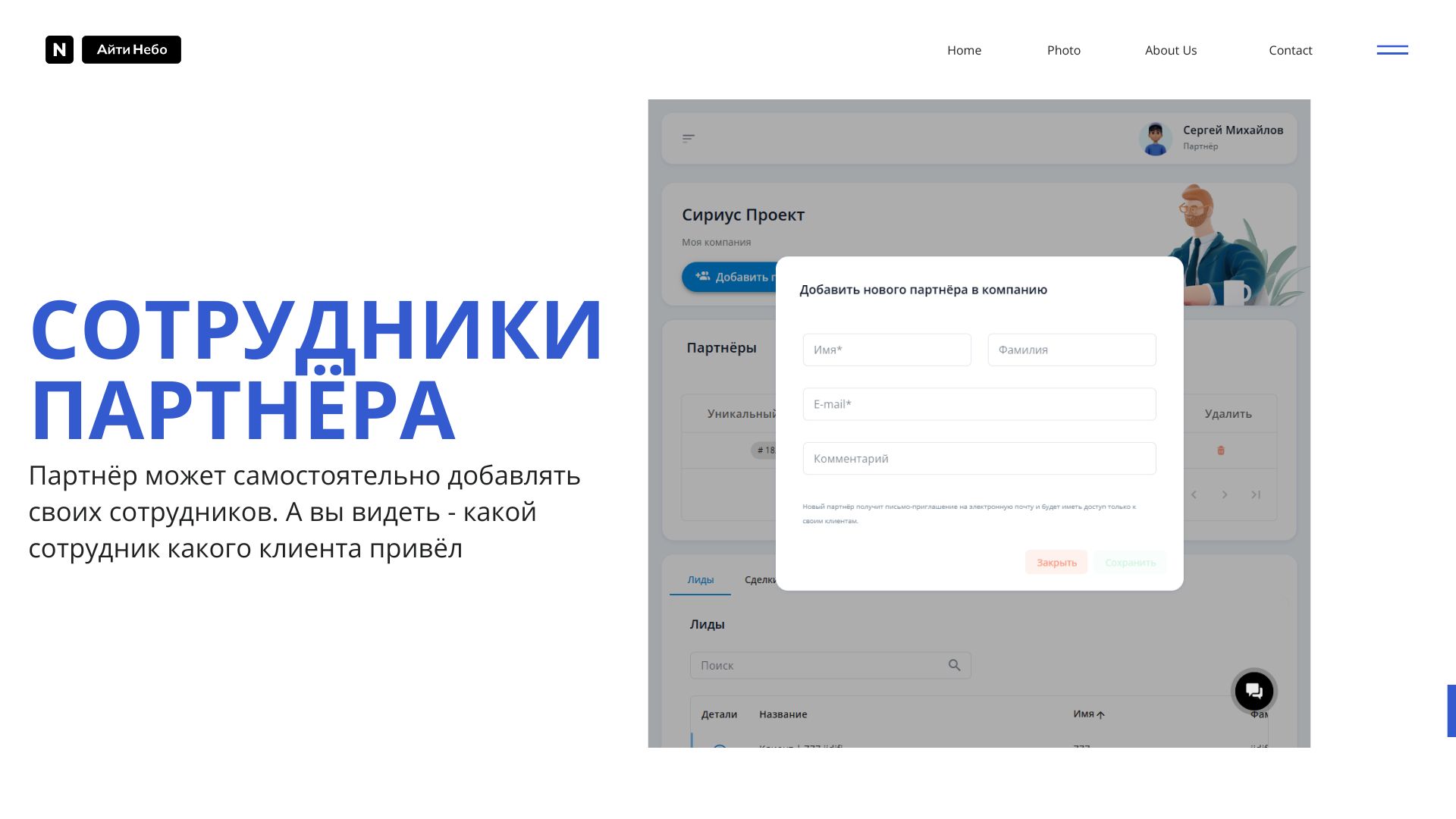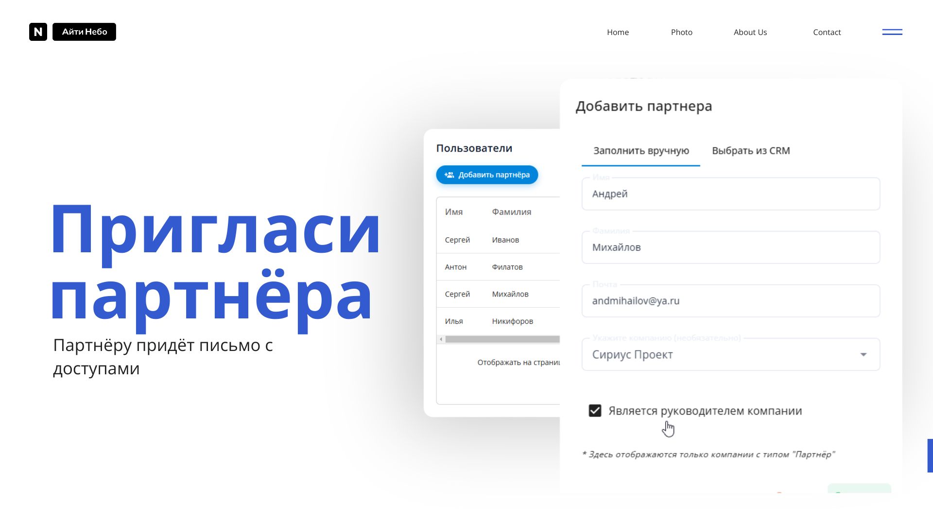 - Разделение ролей: Возможность назначить руководителя компании-партнёра. Руководитель компании-партнёра может приводить новых партнёров в свою компанию прямо из личного кабинета.