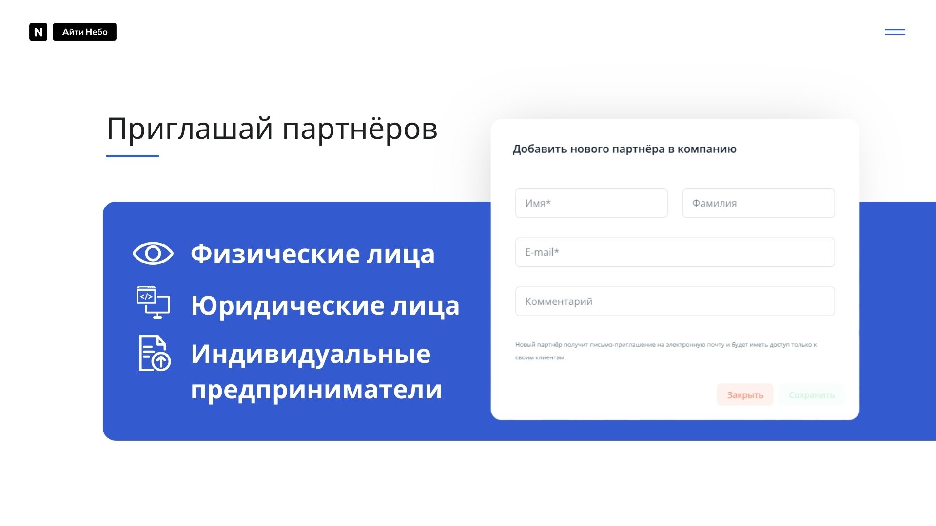 - Взаимодействие: Партнёр может быть как индивидуальным лицом, так и компанией.