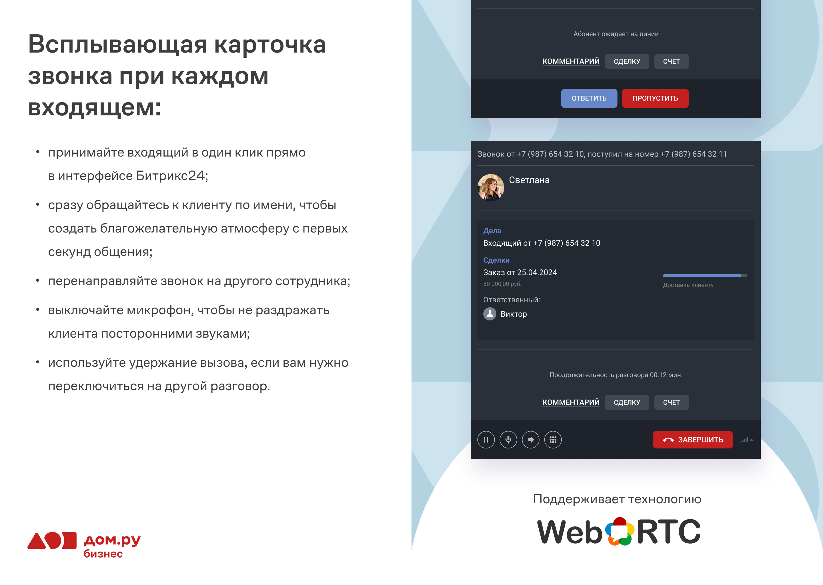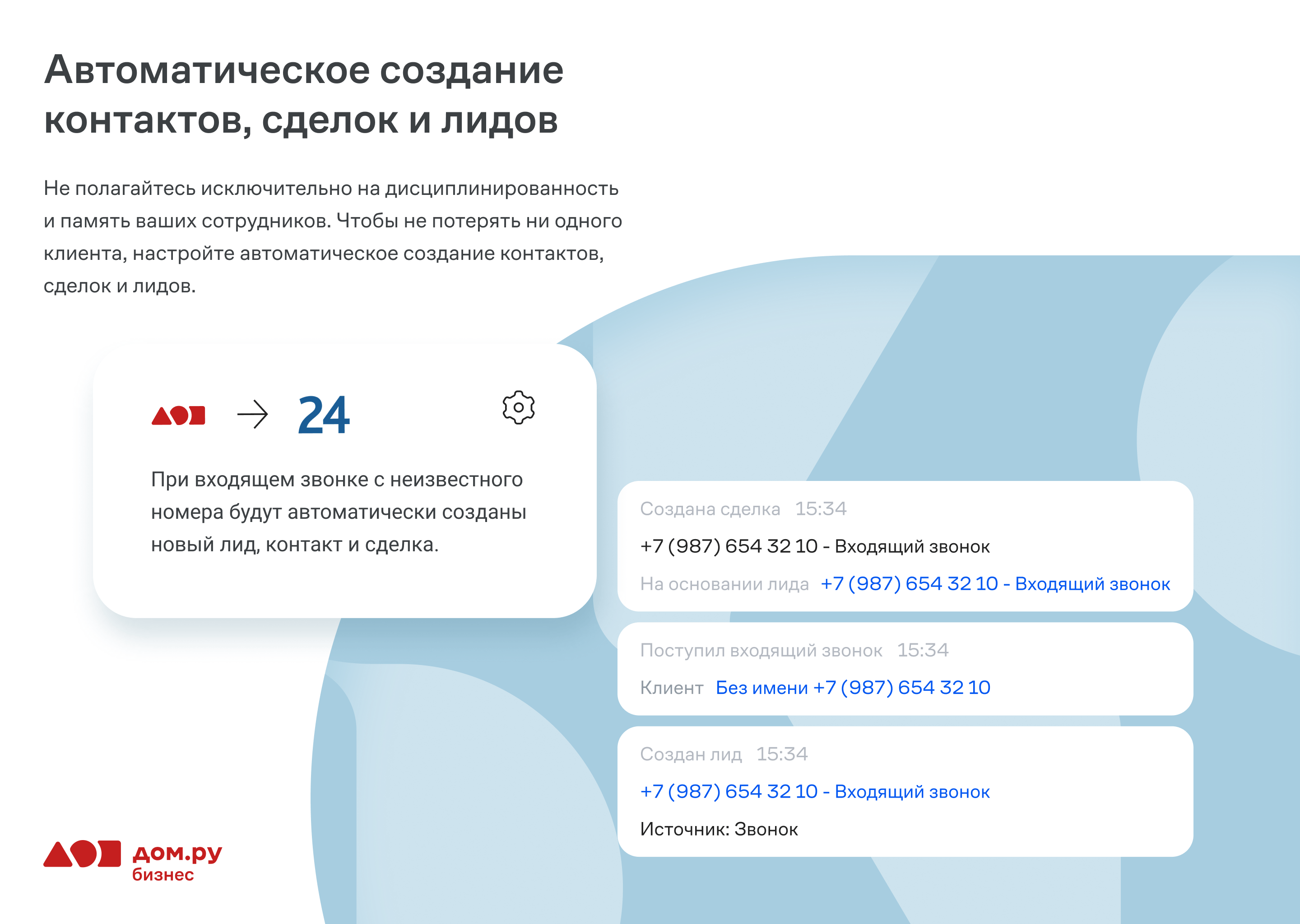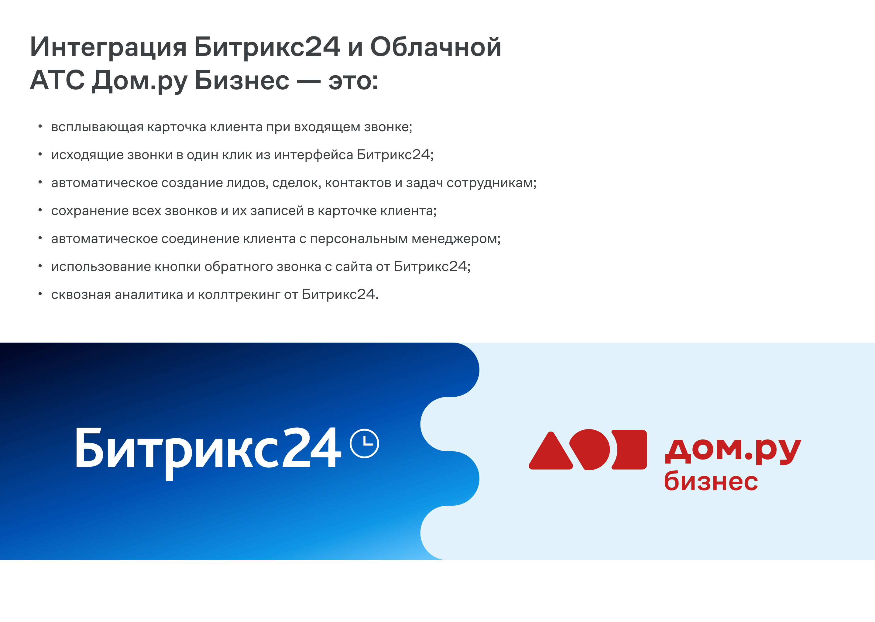 Интегрируйте Облачную АТС от Дом.ру Бизнес и Битрикс24 для автоматизации ваших продаж.