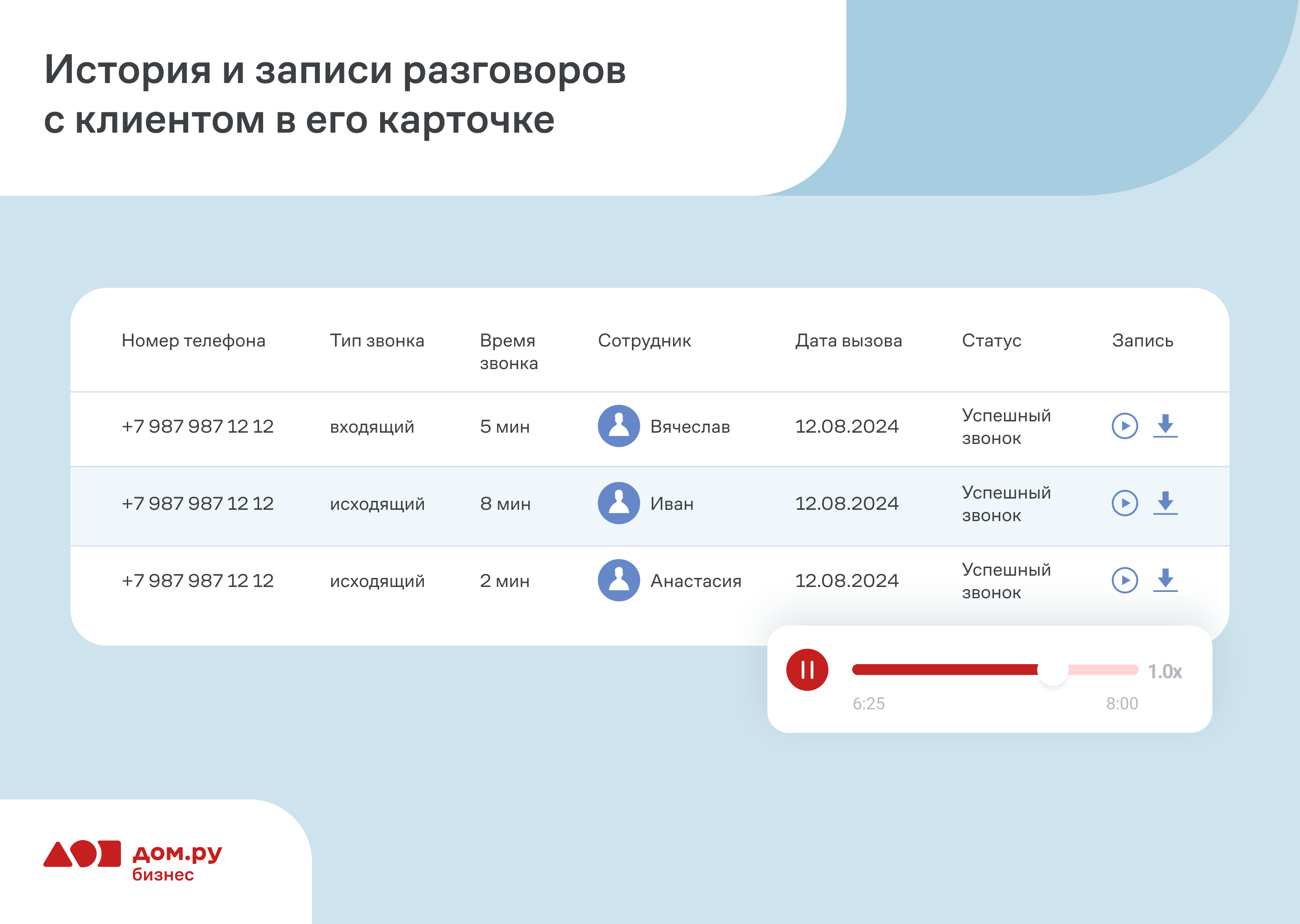 - Информация о всех разговорах записывается в карточку клиента. Вы можете прослушать эти разговоры прямо из Битрикс24.