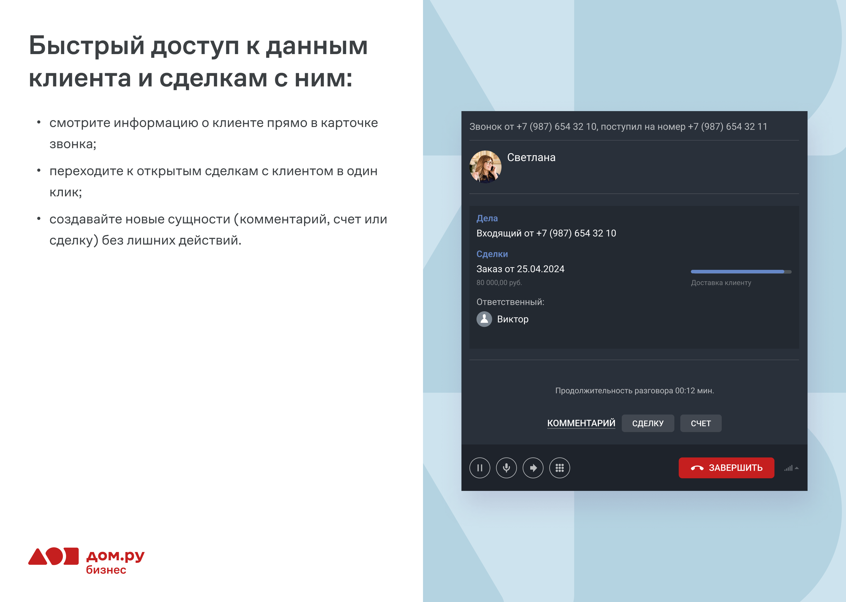 - Всплывающая карточка клиента при входящем звонке. Ваш менеджер увидит, что за клиент звонит и какая сделка открыта. Экономьте время менеджеров и клиентов.