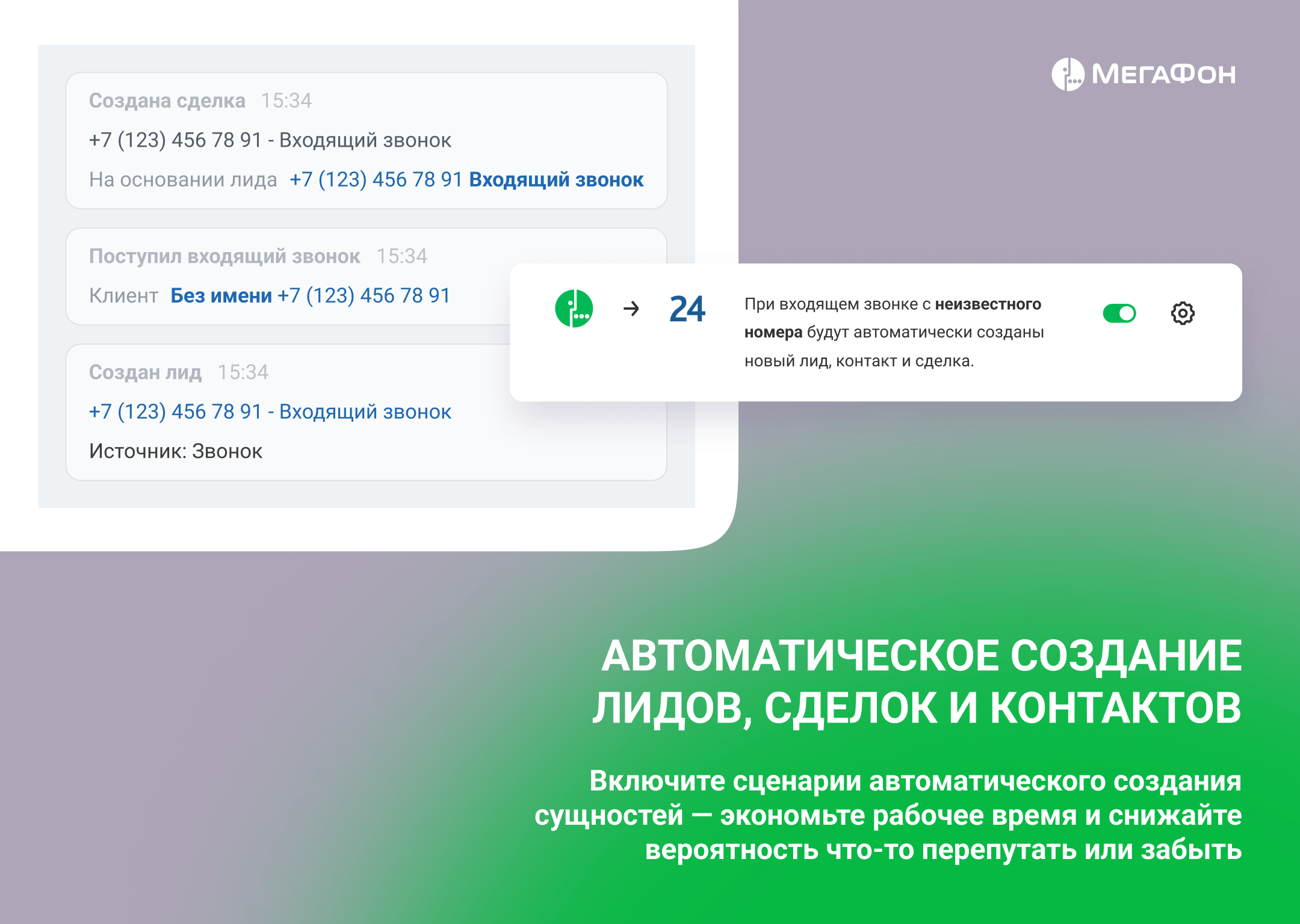 - Отдельные сценарии создания лидов, сделок, контактов и задач для каждого номера или группы номеров Виртульной АТС.