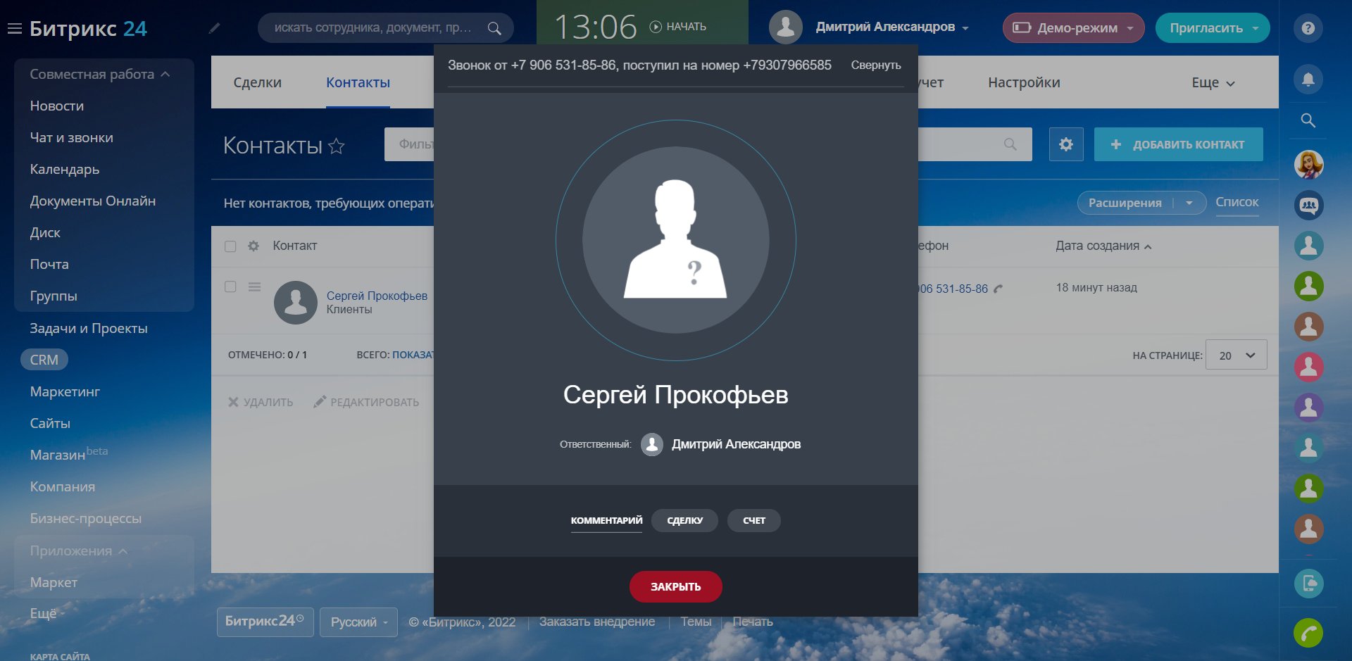 - видеть карточку с именем клиента и историей сотрудничества при входящем звонке