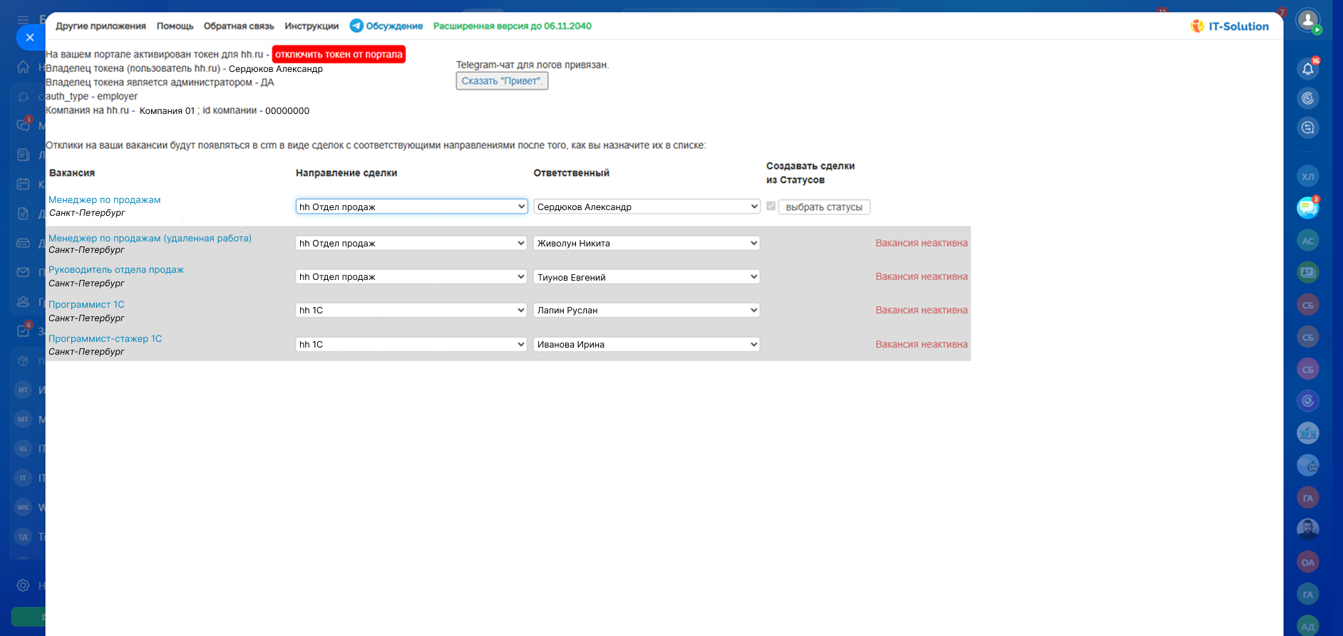 Приложение позволяет автоматически создавать сделки по направлению найма сотрудников на основании откликов с сайта hh.ru.