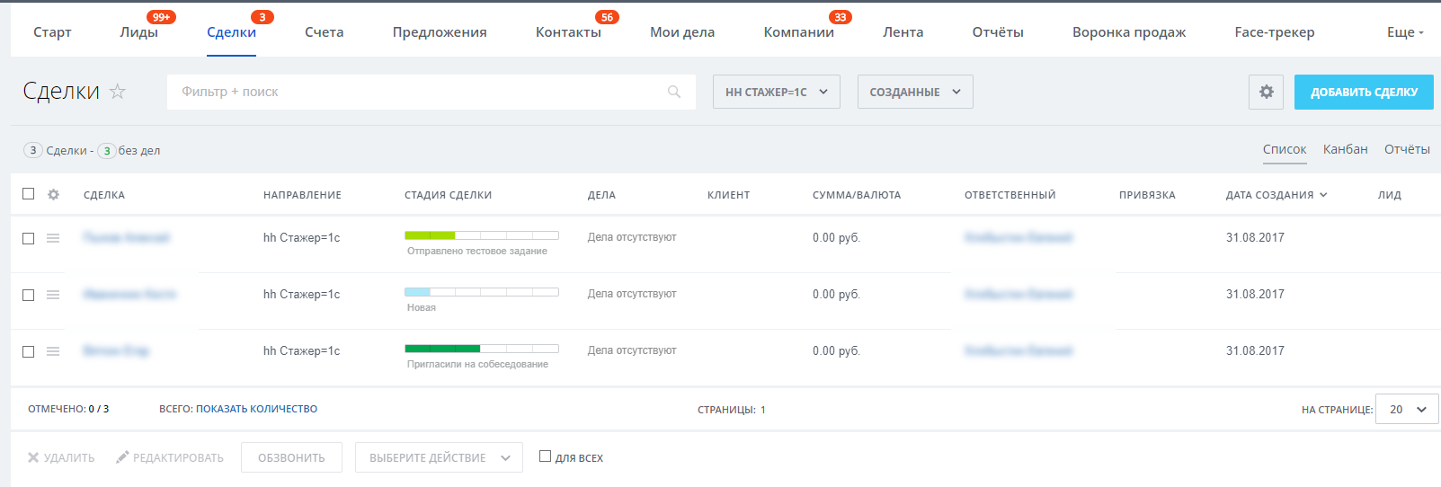 Приложение «Интеграция с hh.ru» не только улучшает и автоматизирует работу вашего HR-отдела, но и дает возможность отслеживать его эффективность. Вы всегда сможете ознакомиться со всеми текущими сделками, запланированными встречами и разобранными откликами.