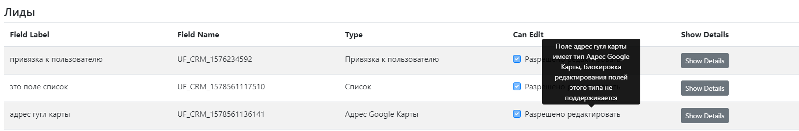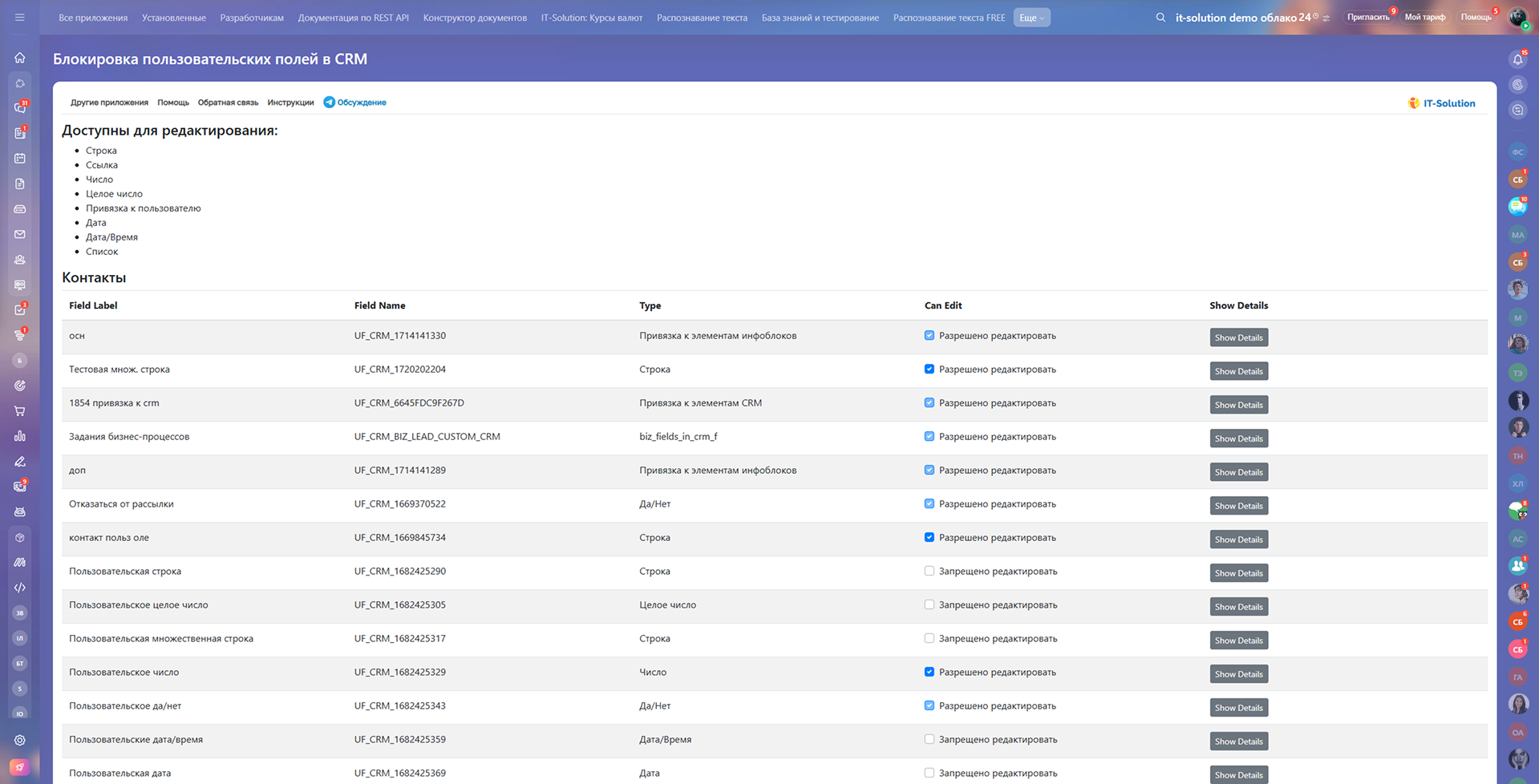 Приложение позволяет запретить редактирование пользовательских полей в CRM Битрикс24. Запрет не позволит менять значения полей вручную, но не затронет бизнес-процессы. Блокировка пользовательских полей может пригодиться, чтобы избежать нежелательных или случайных изменений в ваших Лидах, Сделках, Компаниях и Контактах.