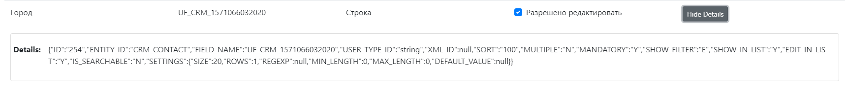 По умолчанию для всех созданных пользовательских полей редактирование разрешено. Чтобы заблокировать эту возможность, найдите нужное поле в списке для нужной вам сущности CRM (Лид, Контакт и т.д.) и снимите галочку "Разрешить редактирование". Новые права незамедлительно вступят в силу, а статус поля в приложении будет отображаться как "Запрещено редактировать".