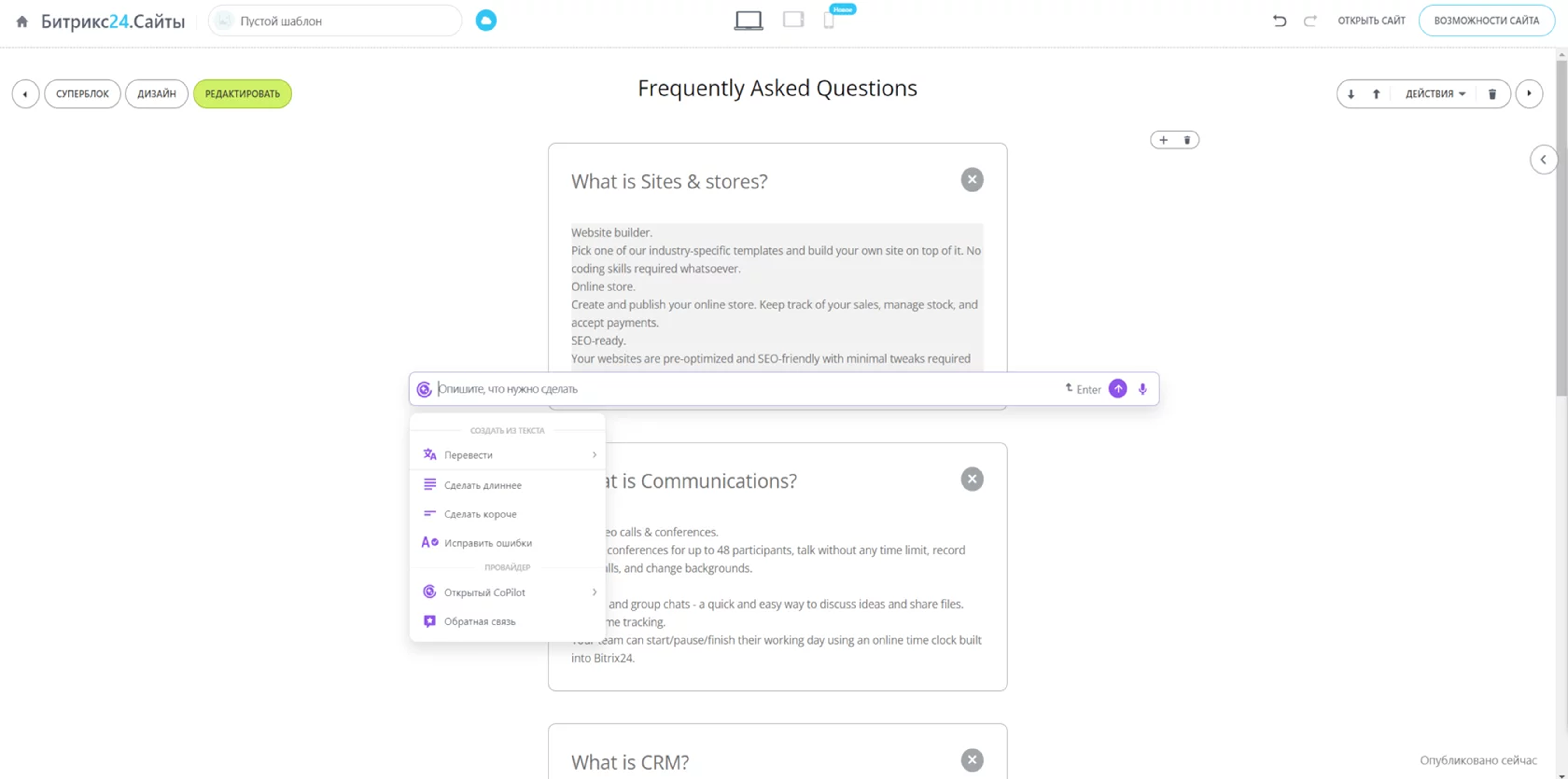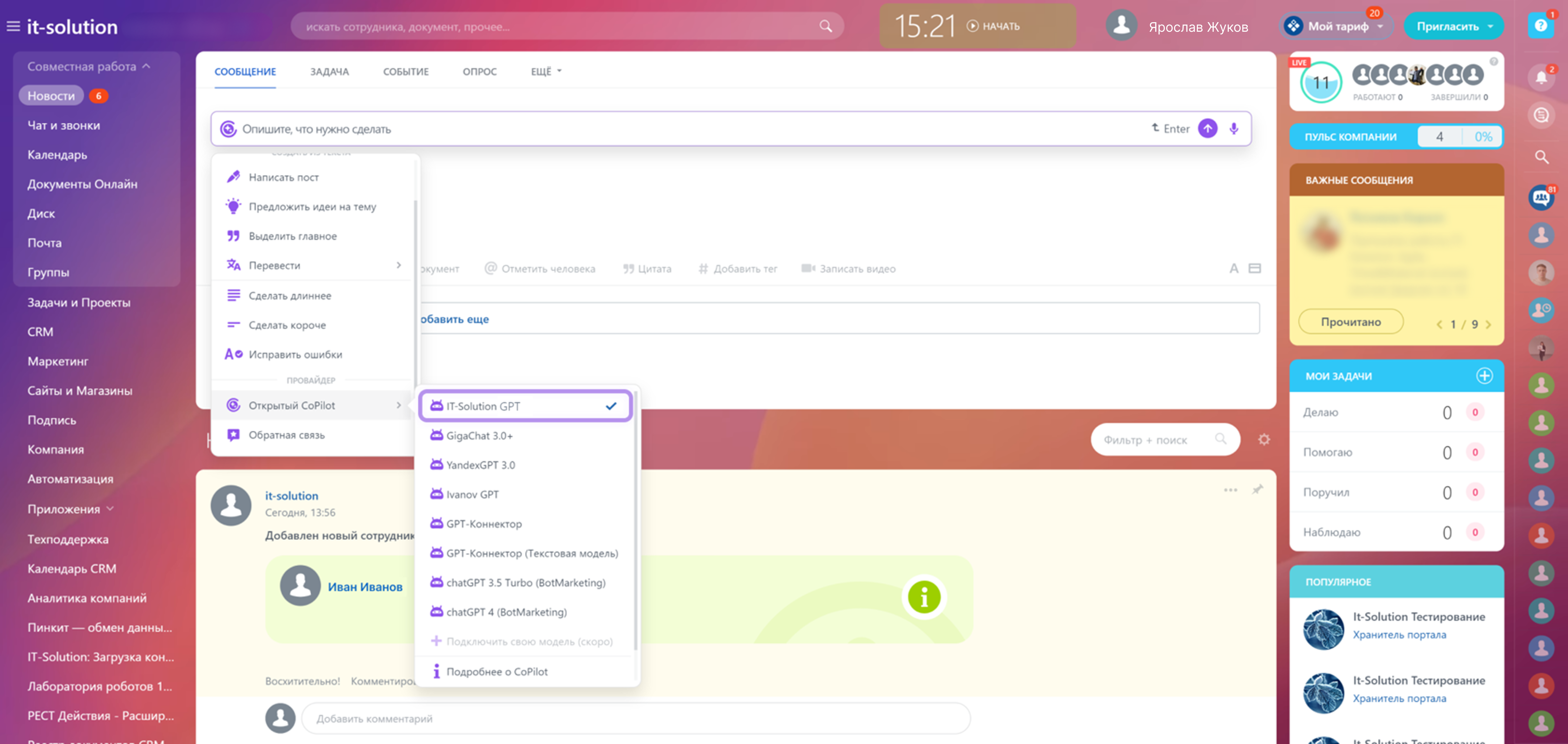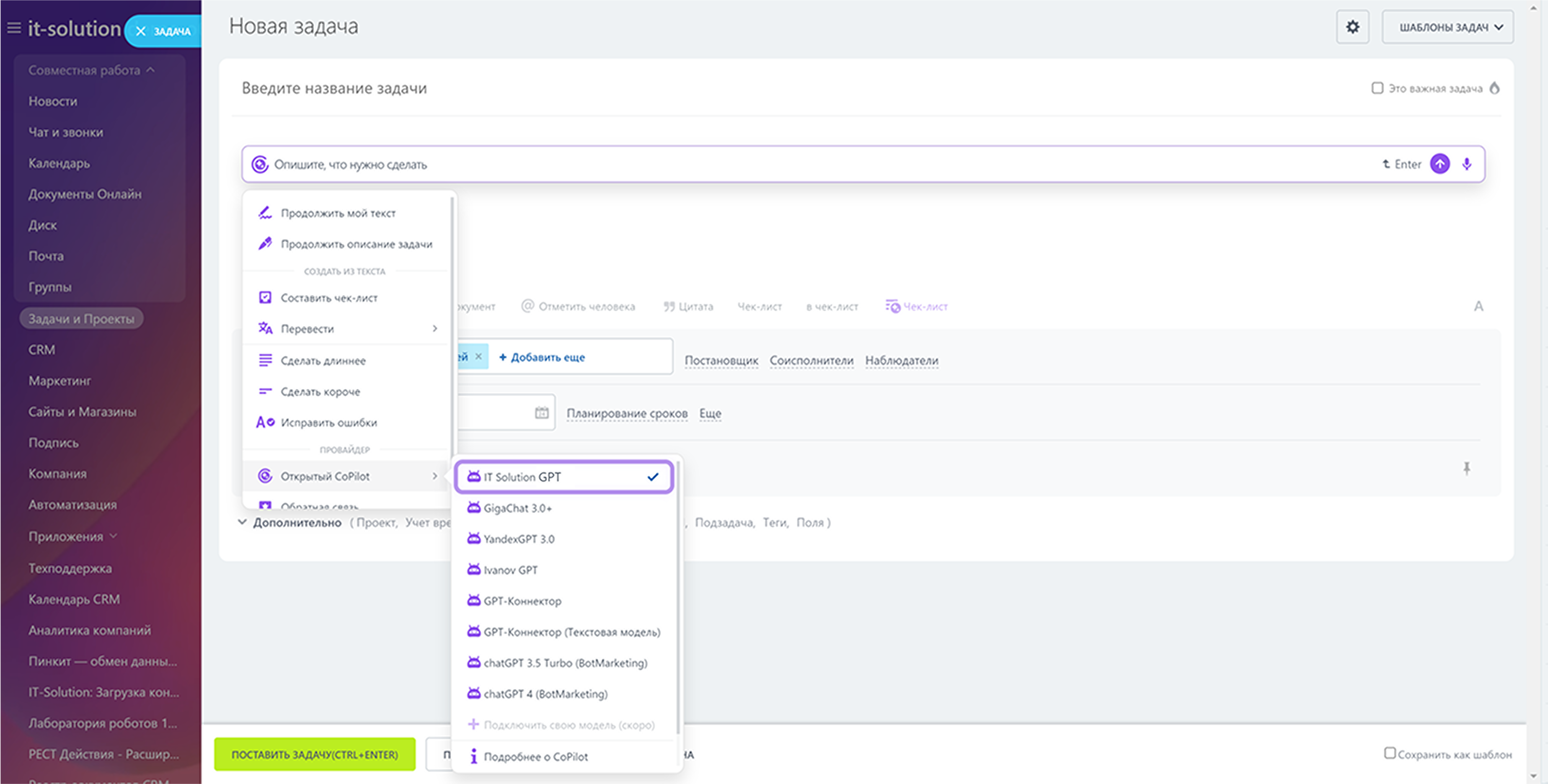 GPT-Коннектор — приложение, которое позволяет интегрировать нейросеть ChatGPT на ваш портал Битрикс24 и пользоваться ей с помощью CoPilot. Используйте возможности искусственного интеллекта для решения различных бизнес-задач! На сегодняшний день функция представлена в 6 разделах: CRM, Чаты, Лента, Задачи, Сайты, Почта.
