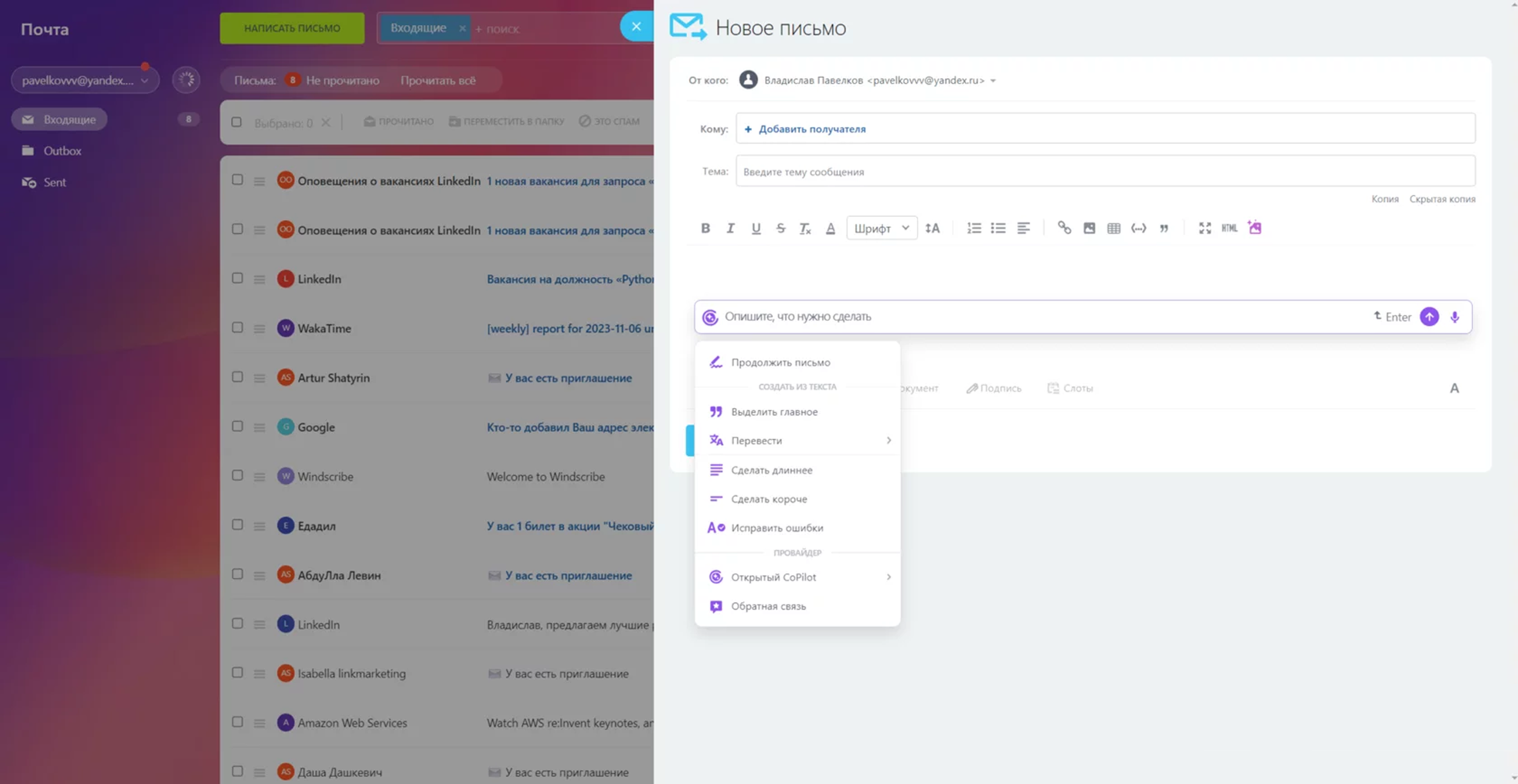 Нужен уникальный пост в живой ленте? Просто сформулируйте тему поста, а остальное нейросеть сделает за вас. Кроме того, CoPilot поможет экономить время на прочтение постов коллег. Достаточно попросить ИИ сформировать краткое содержание из большого текста, чтобы быстро получить самую главную информацию.
