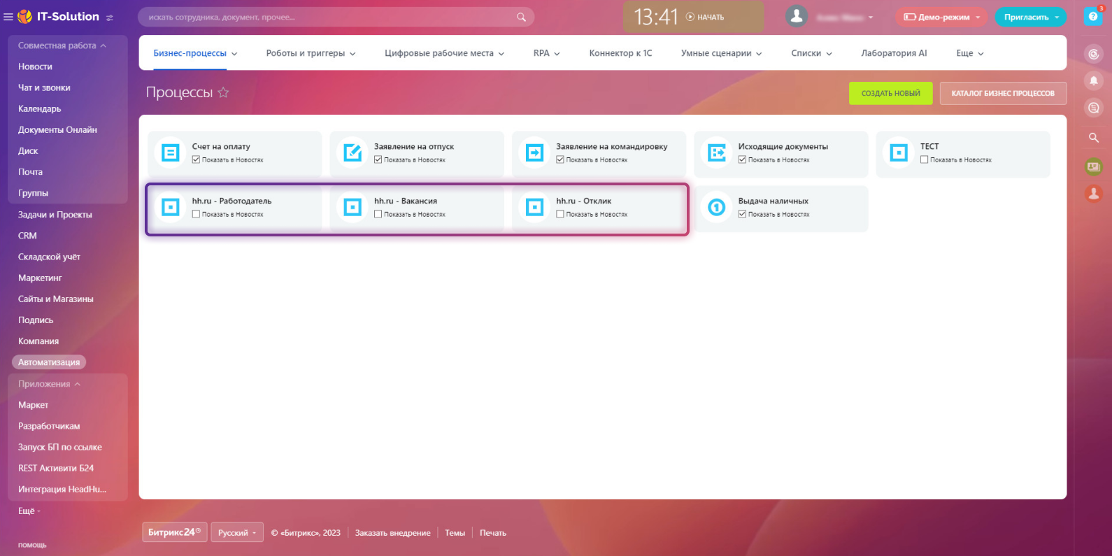 Новая интеграция с Head Hunter от компании IT-Solution. Приложение позволяет получить все отклики с hh.ru в виде элементов Бизнес-процессов (Списков).