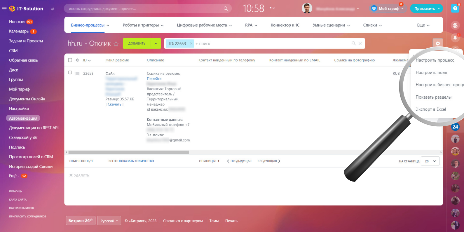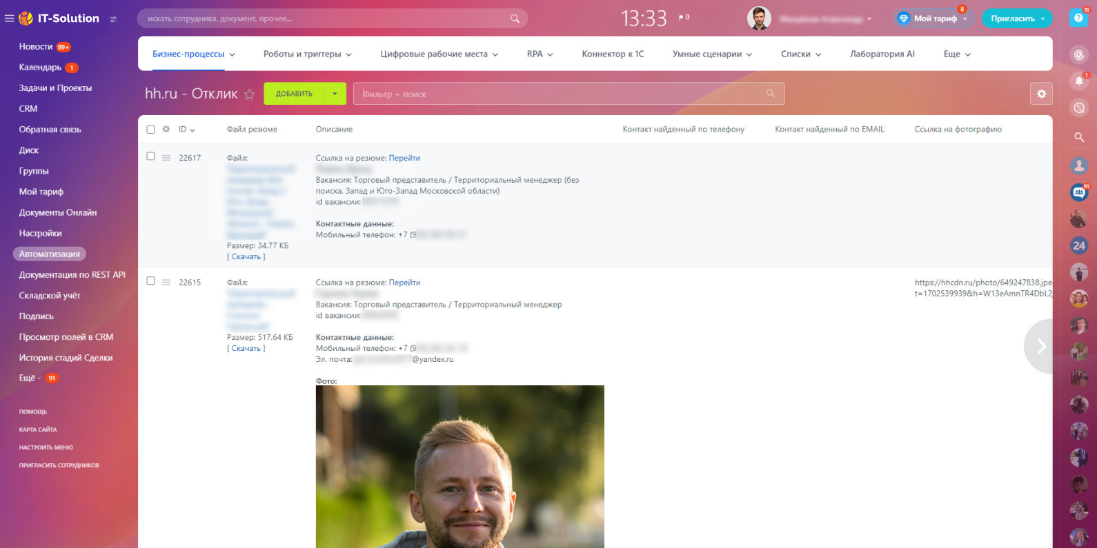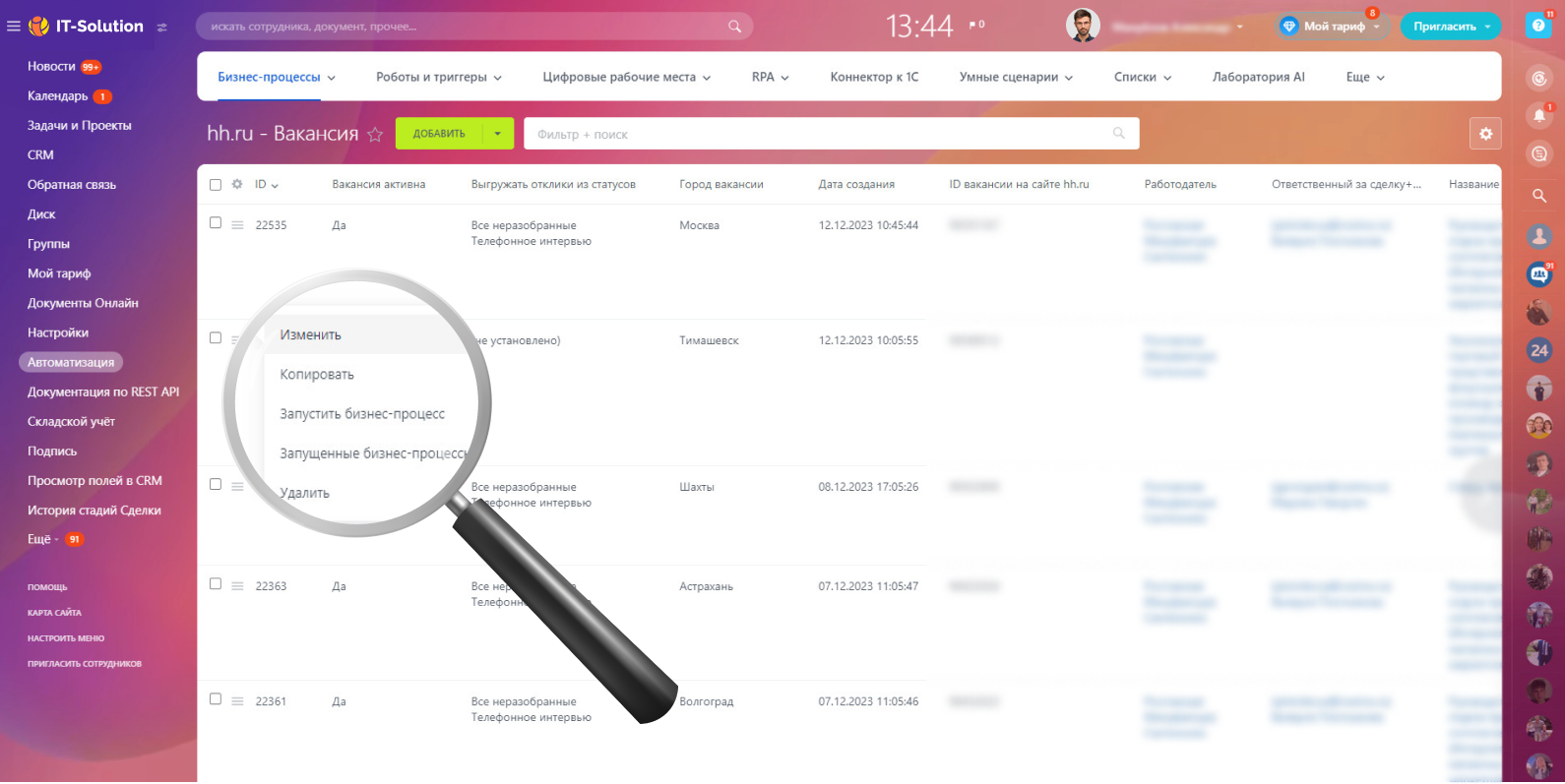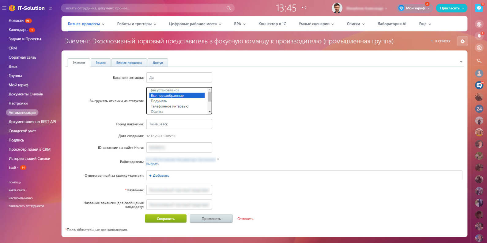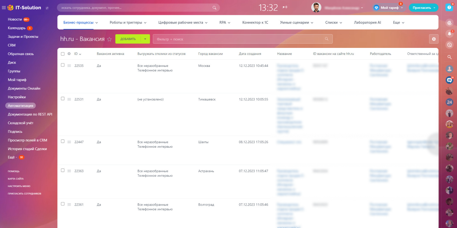 Сотрудникам HR-отдела больше не придется заходить на hh.ru, чтобы посмотреть и разобрать отклики по вакансиям. Каждые 10 минут приложение будет автоматически собирать данные, отправлять все новые отклики на ваш портал Битрикс24 в виде элементов Бизнес-процессов.