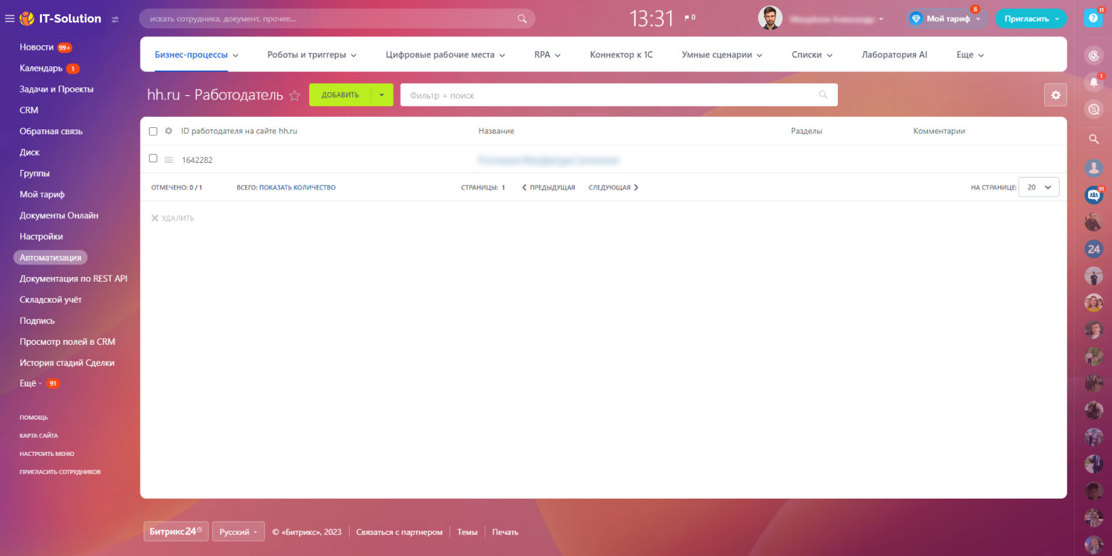 Интеграция HeadHunter (hh.ru) Pro — новая версия приложения, которое позволит вам автоматизировать работу HR-отдела. Теперь вы сможете автоматически получать все отклики с hh.ru в виде элементов Бизнес-процессов (Списков). Кроме того, по многочисленным просьбам наших пользователей мы добавили возможность подключать к приложению несколько работодателей одновременно. Всё это значительно ускорит процесс поиска и найма новых сотрудников, а также обеспечит высокую репутацию на портале hh.ru.