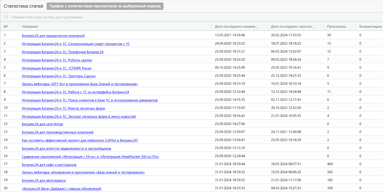 Данные по количеству статей в Базе знаний и персональная статистика пользователей.