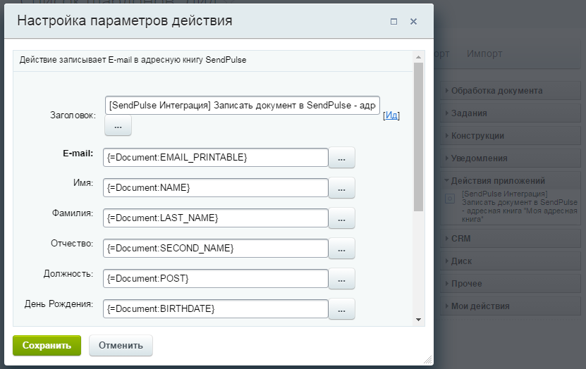 - Настройте бизнес-процессы для осуществления записи Email адресов в выбранные адресные книги SendPulse