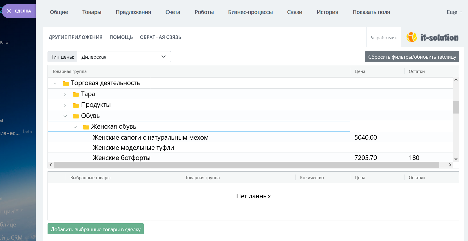 После авторизации в приложении, данные о номенклатуре из 1С подтянутся на портал. Вы сможете найти их в карточке сделки, где появится новая вкладка Подбор товаров из 1С. Там появится таблица с данными о товарах.