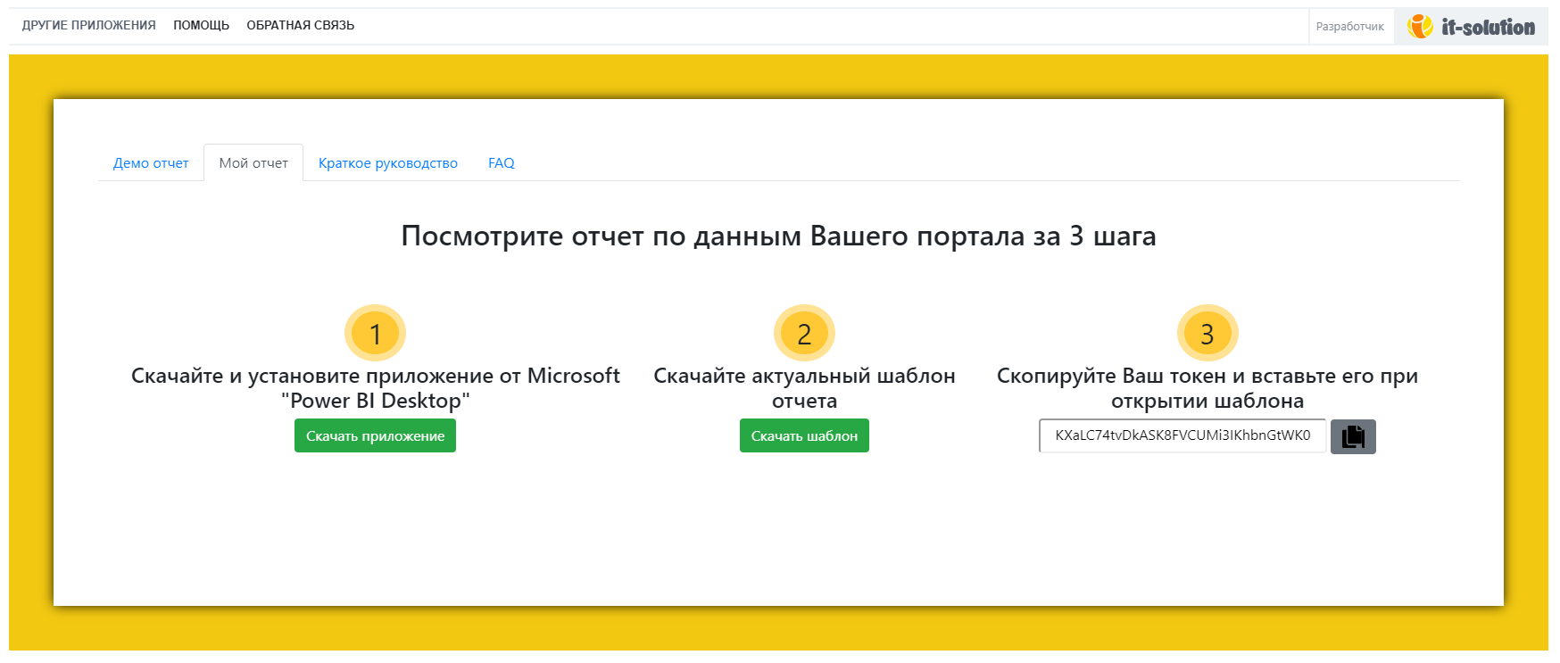 Установите приложение Интеграция с Power BI на Ваш портал Битрикс24. Откройте приложение после установки. Внутри вы найдете токен для интеграции, шаблон отчета для Microsoft Power BI и подробную инструкцию о том, как получить данные из Вашего Битрикс24 в Microsoft Power BI.