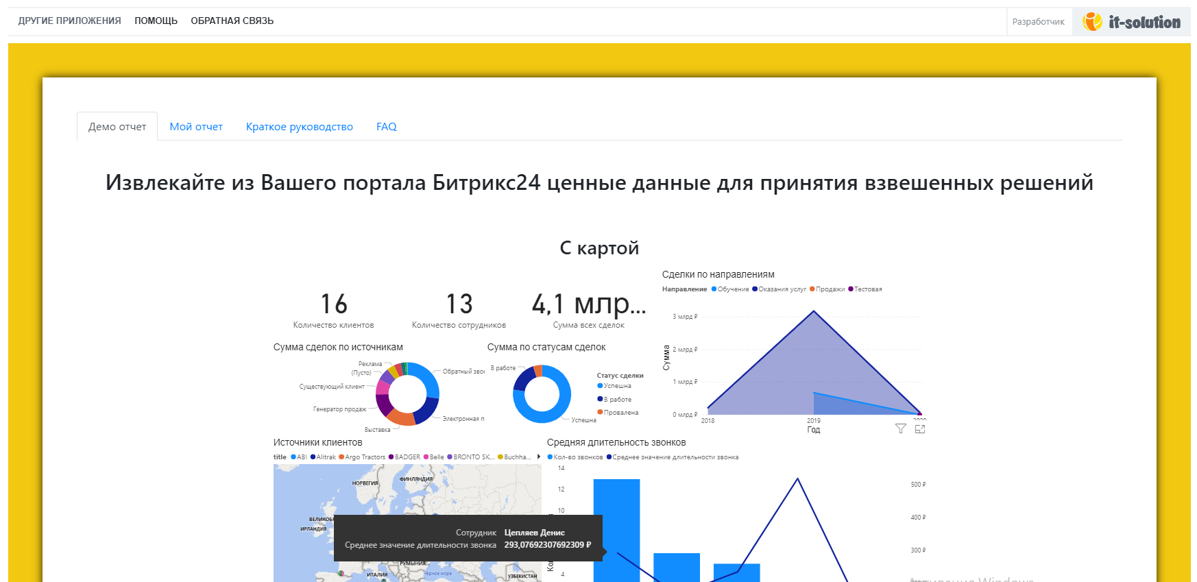 Новое приложение Интеграция с Power BI от компании IT-Solution позволит Вам получать основные данные по сделкам, задачам и звонкам с вашего портала Битрикс24 в программу Microsoft Power BI. Вы сможете использовать все огромные возможности Microsoft Power BI и составлять отчеты по данным из Битрикс24, благодаря простой и надежной интеграции.