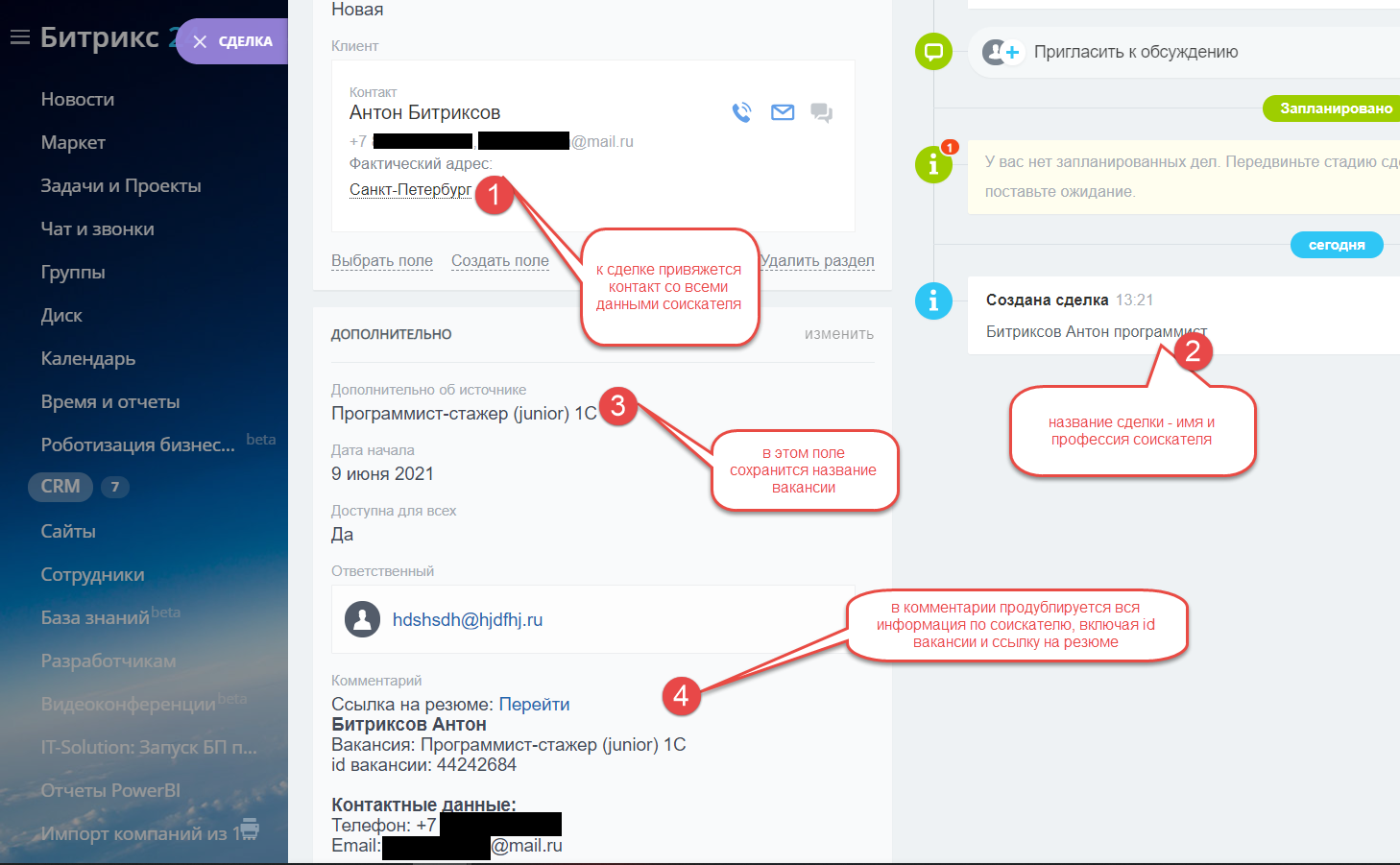 Теперь вы можете работать с откликами прямо через CRM! Таким образом, история вашего взаимодействия с соискателем сохранится в его сделку, которую вы сможете передвигать по удобным для вас стадиям. Приложение выгружает все отклики за последние 60 дней, которые не в статусе "Отказ".