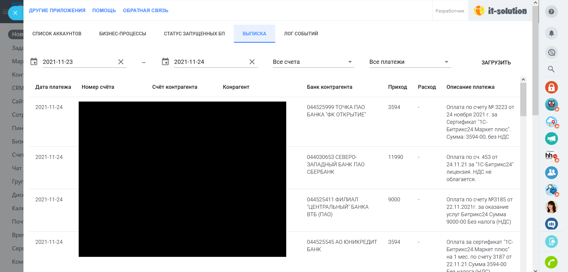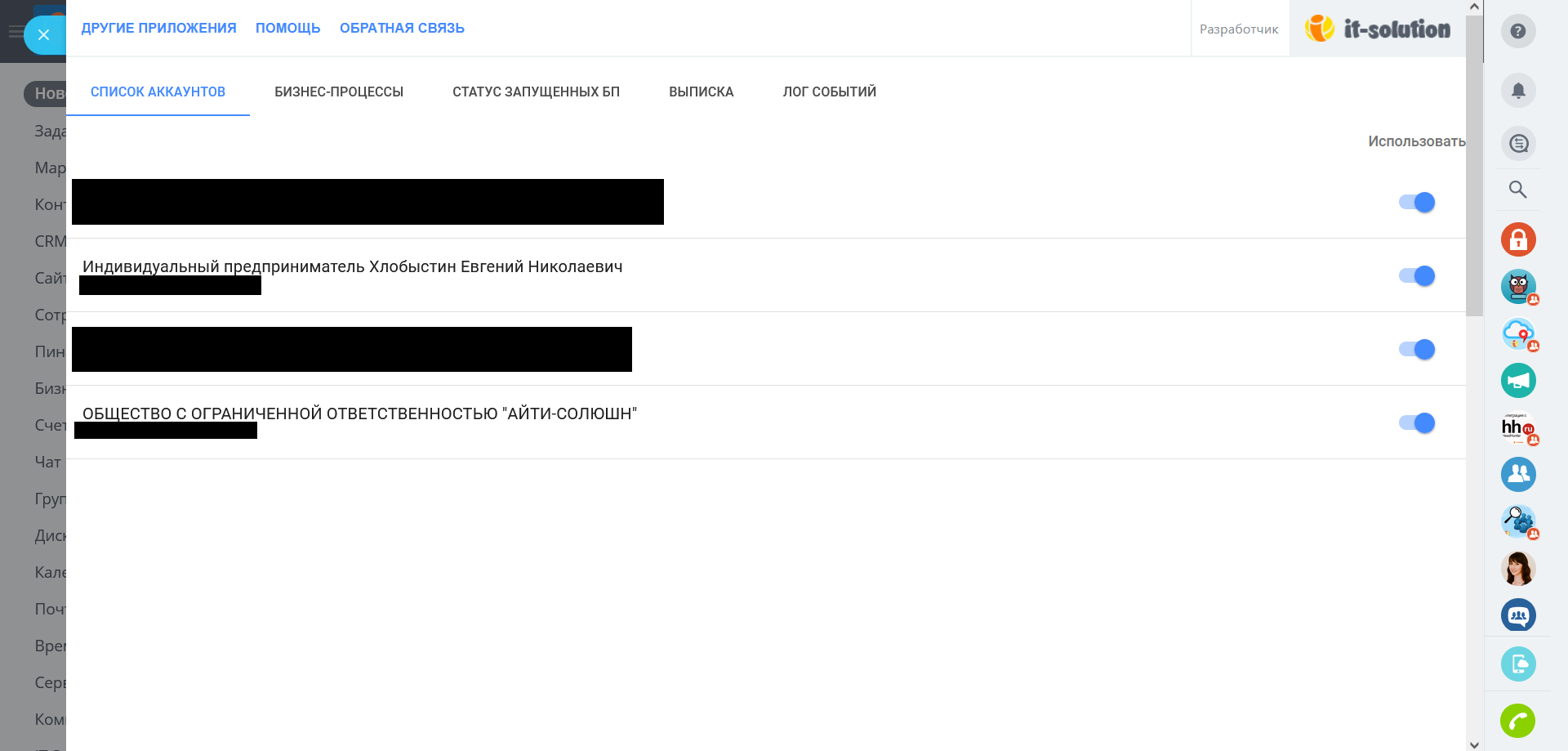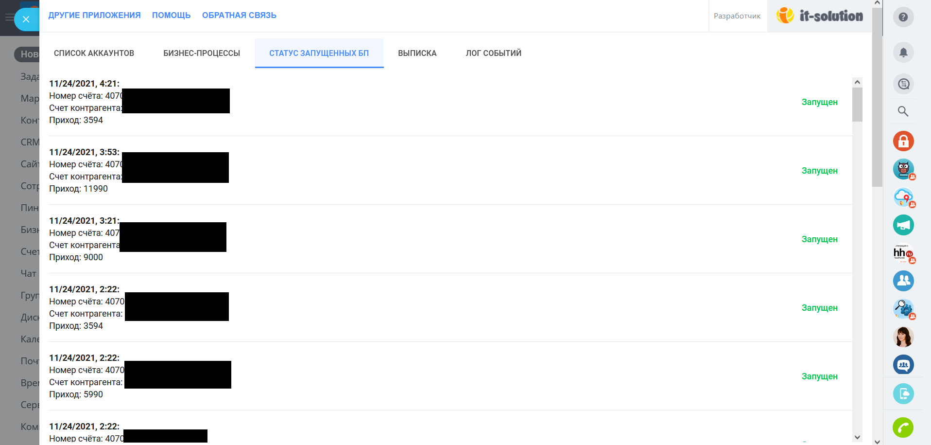 После авторизации в приложении на вкладке Список Аккаунтов появится информация по вашим счетам. Если вы включите переключатель Использовать, вы сможете увидеть выписки на вкладке Выписка (можно выводить список в интервале по выбранным датам), а также настраивать бизнес-процессы, передавая в параметры значения по выбранным счетам.