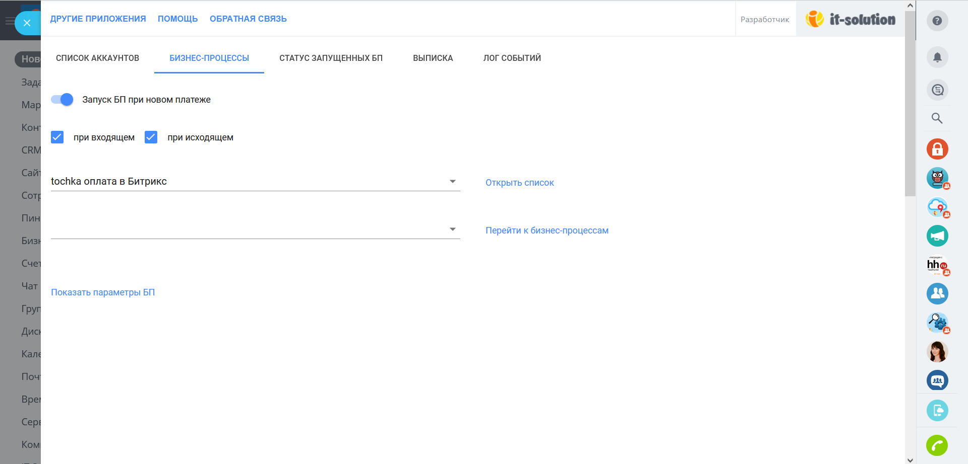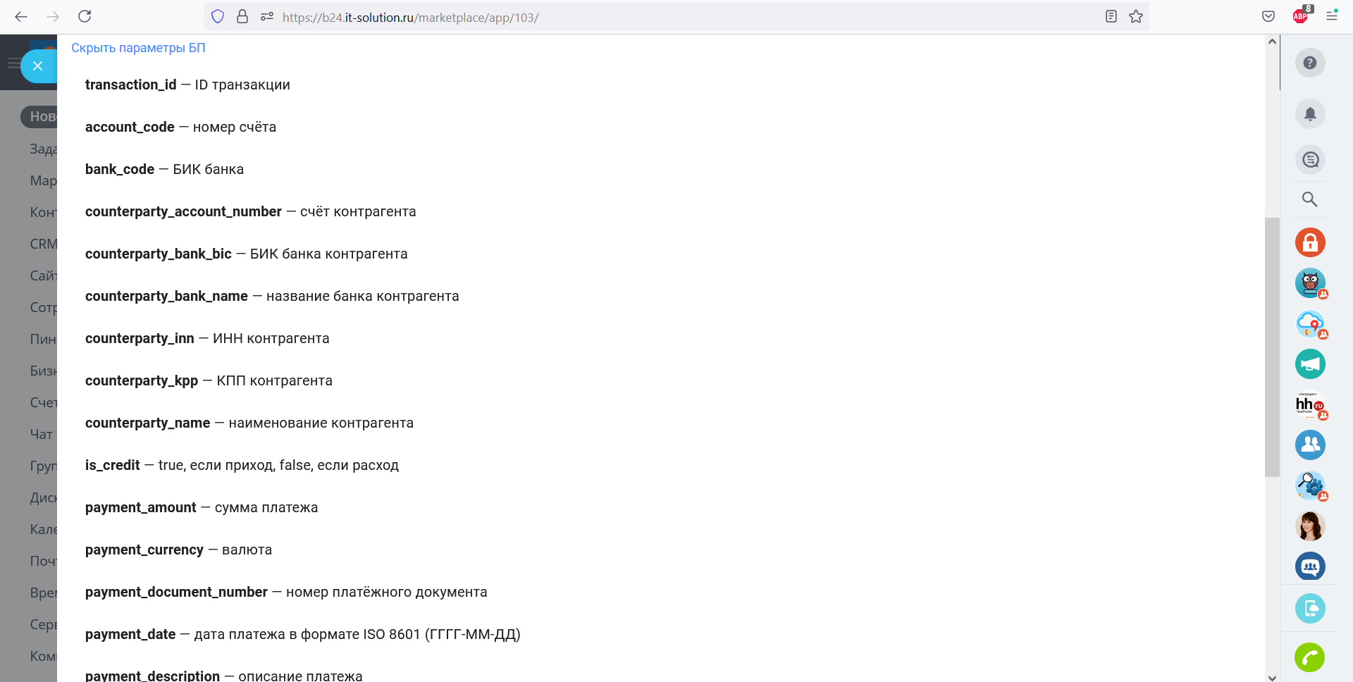 Полный список параметров, доступных для бизнес-процессов, можно посмотреть на вкладке Бизнес-процессы. С их помощью вы можете, к примеру, создать уведомление, которое будет показывать в колокольчик выбранным пользователям на портале информацию о поступающих платежах. Там же появится список доступных бизнес-процессов для работы с параметрами.