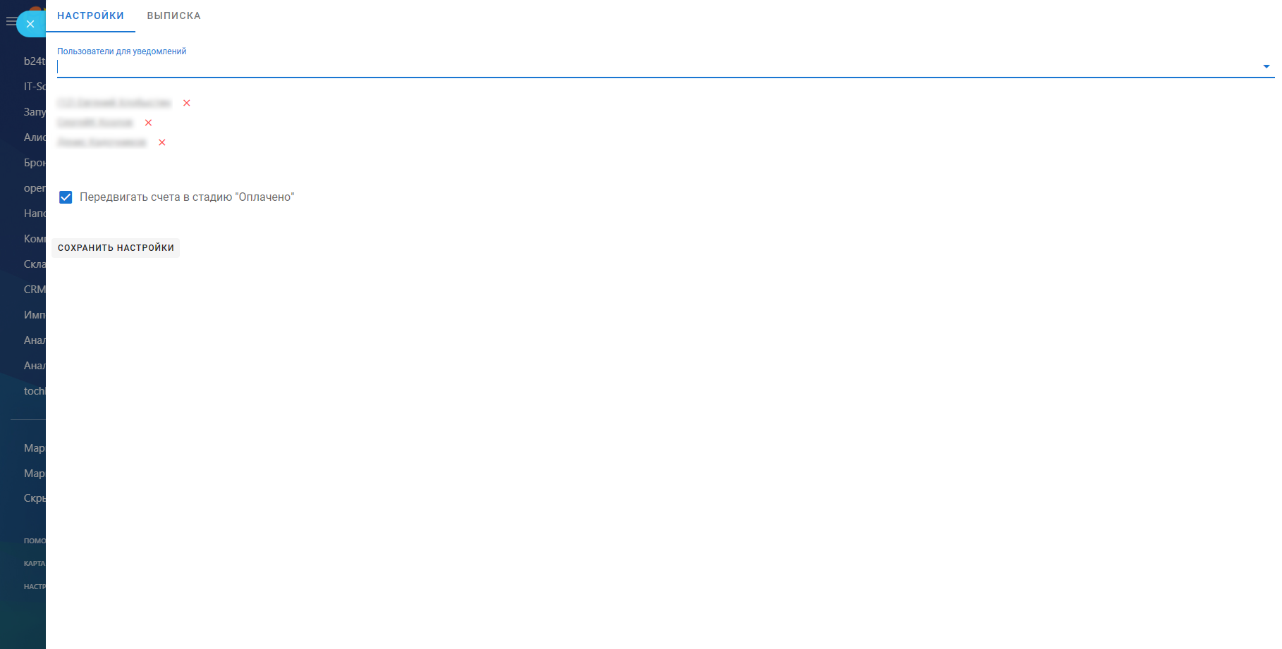 - Во вкладке «Настройки» вы сможете добавить пользователей портала Битрикс24, которые будут получать уведомления о платежах.