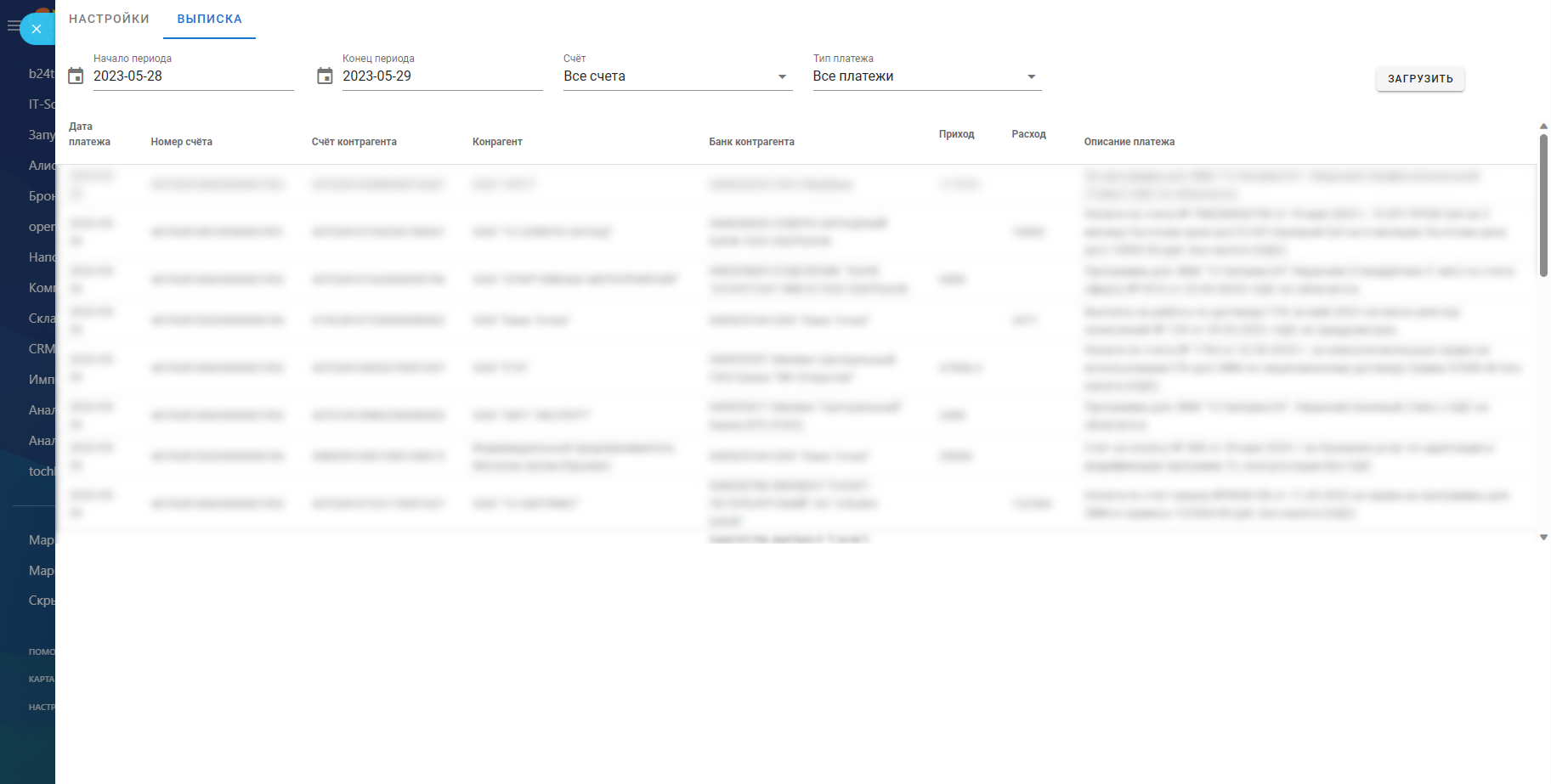 С помощью приложения вы сможете просмотреть выписку по счетам в банке «Точка» непосредственно на вашем портале Битрикс24. При формировании выписки вы сможете указать нужный период, а также выбрать тип счетов и платежей.