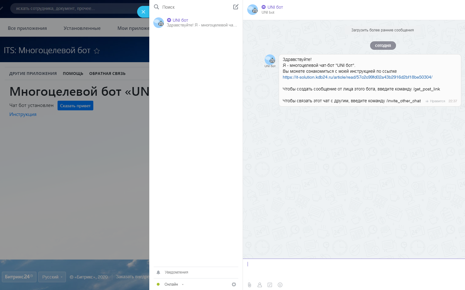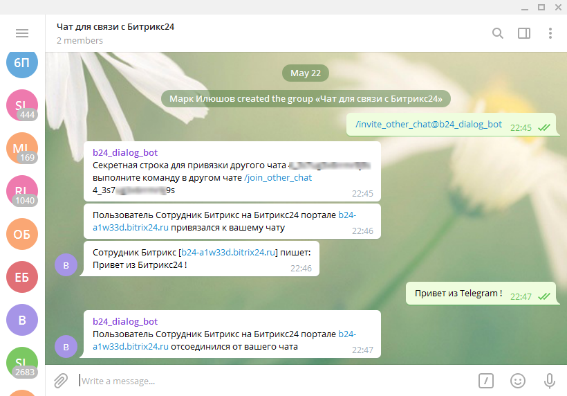 Также он может соединять несколько Telegram-Чатов и Битрикс24-Чатов и пересылать сообщения между ними.