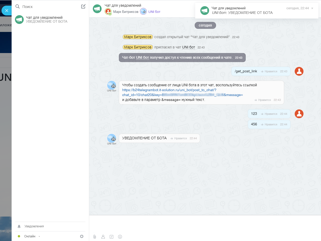 Многоцелевой Чат-бот позволяет автоматизировать на портале уведомления в чаты и личные сообщения.