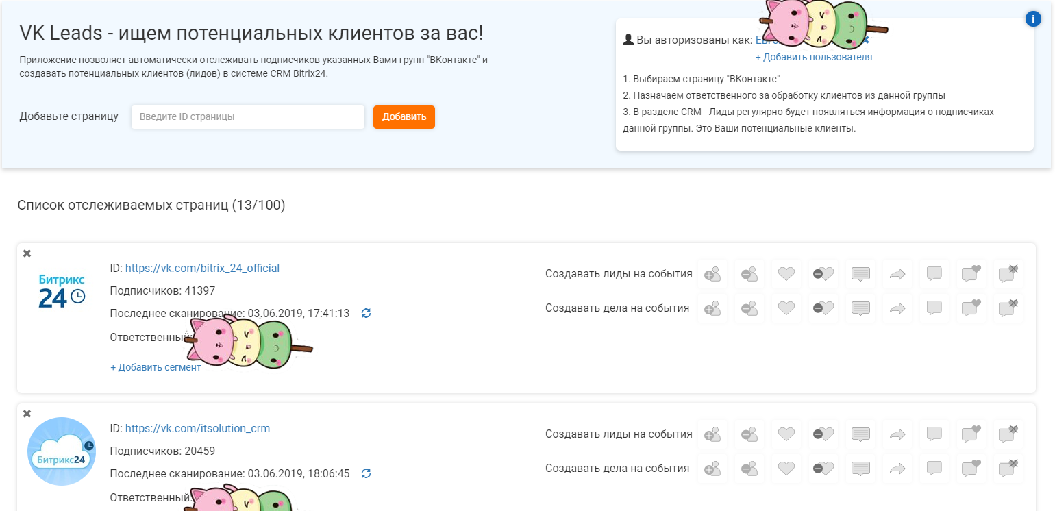 Приложение позволяет автоматически формировать базу потенциальных клиентов в Битрикс24 на основе вашей аудитории в группах VK.