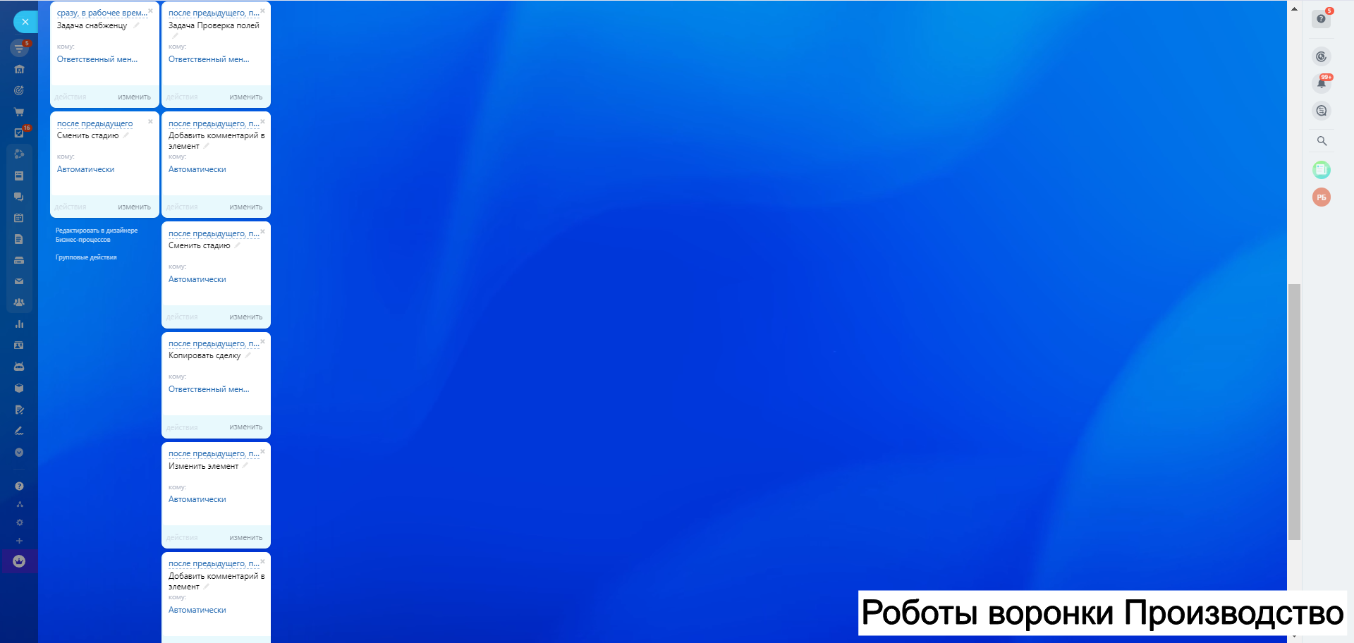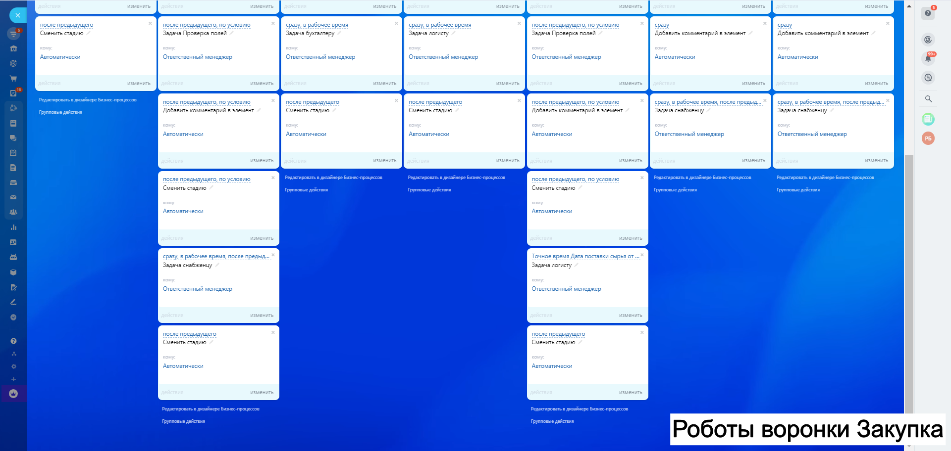 Содержит процессы лидогенерации, продажа товара с производства, производственная воронка, монтаж, процесс закупки, процесс подрядного производства.