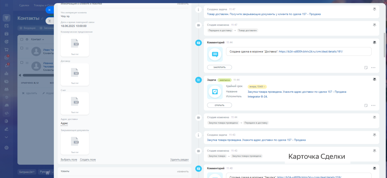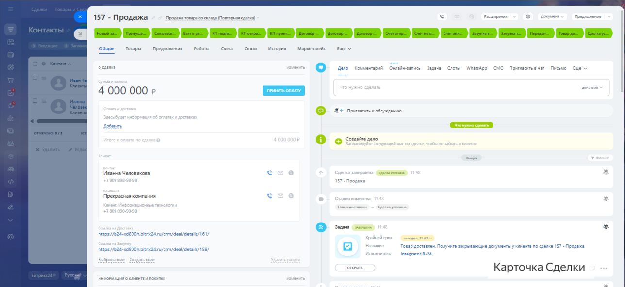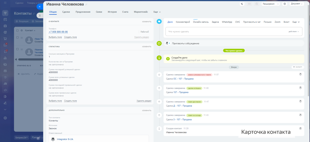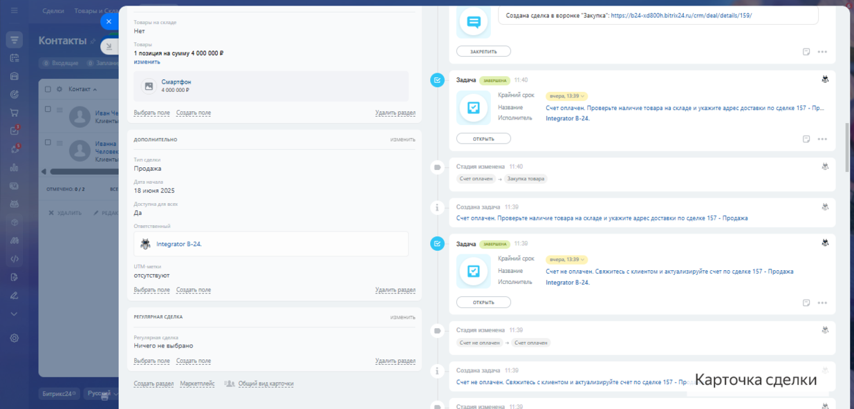 Система автоматически напоминает о звонках, формирует КП, контролирует оплаты и даже создаёт задачи для бухгалтерии. Если клиент не отвечает – система предложит перенести контакт, а если сделка затягивается – уведомит руководителя.