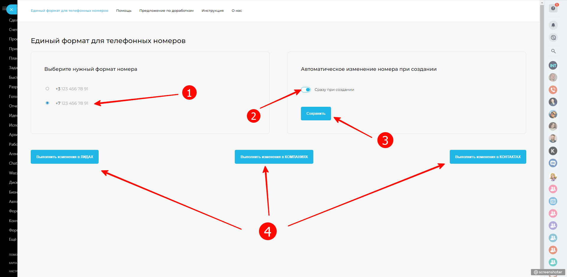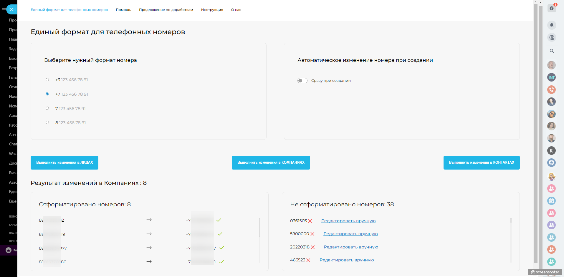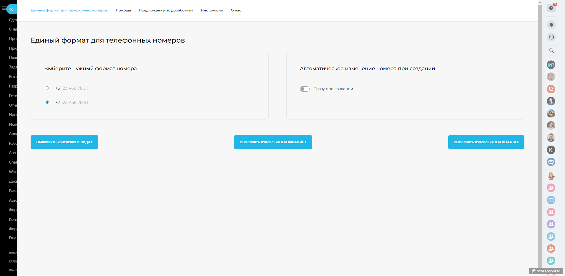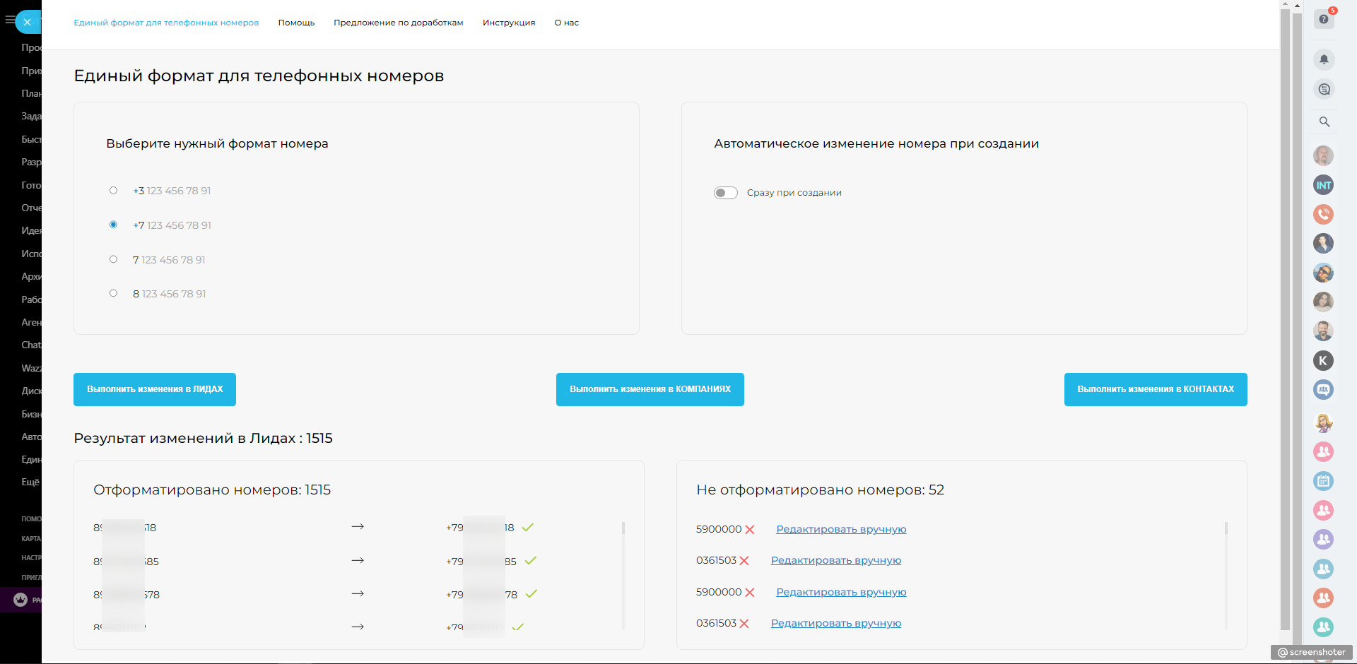 1. Приложение позволяет обработать текущую базу Лидов, Контактов и Компаний, привести формат телефонных номеров к виду +7 …, +3..., на выбор.