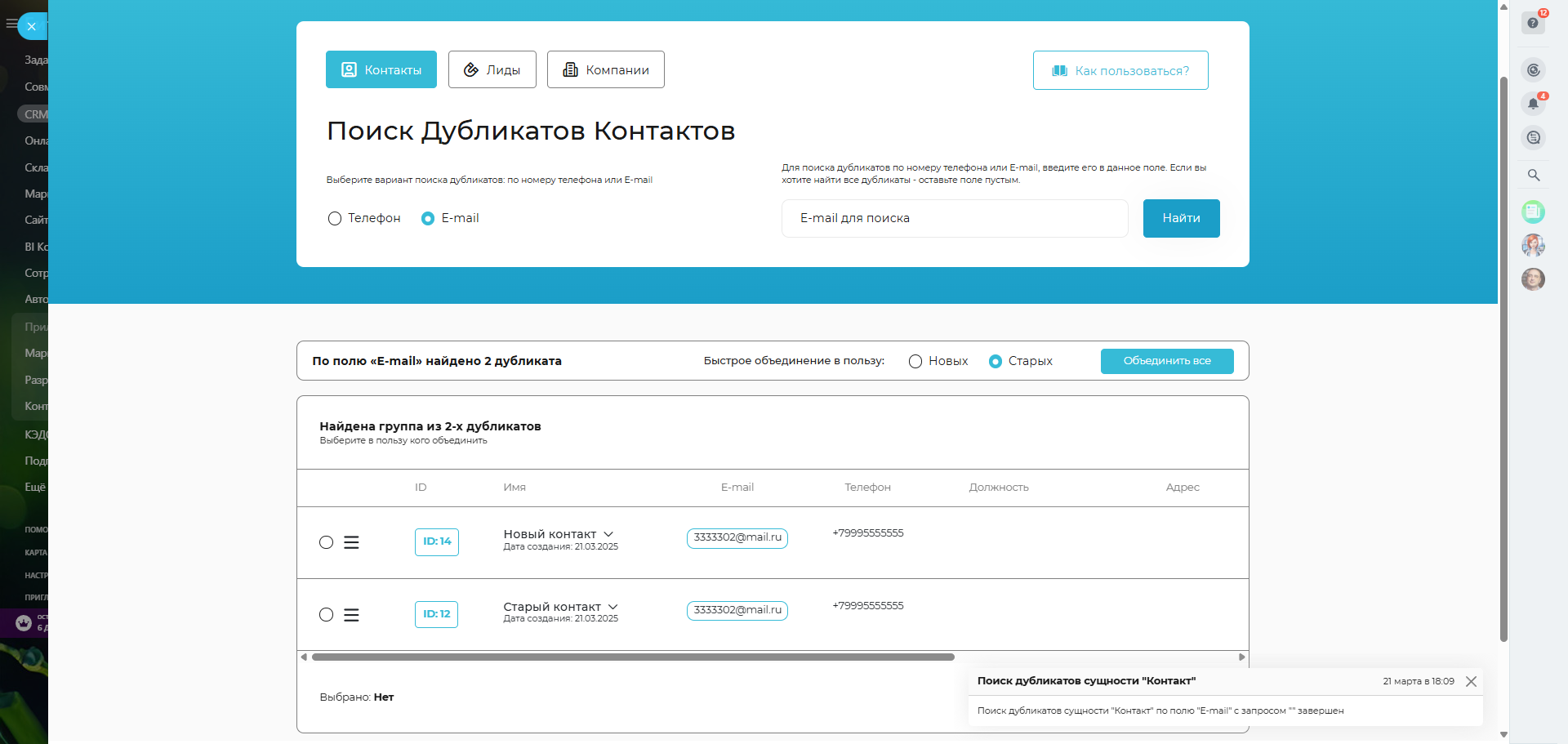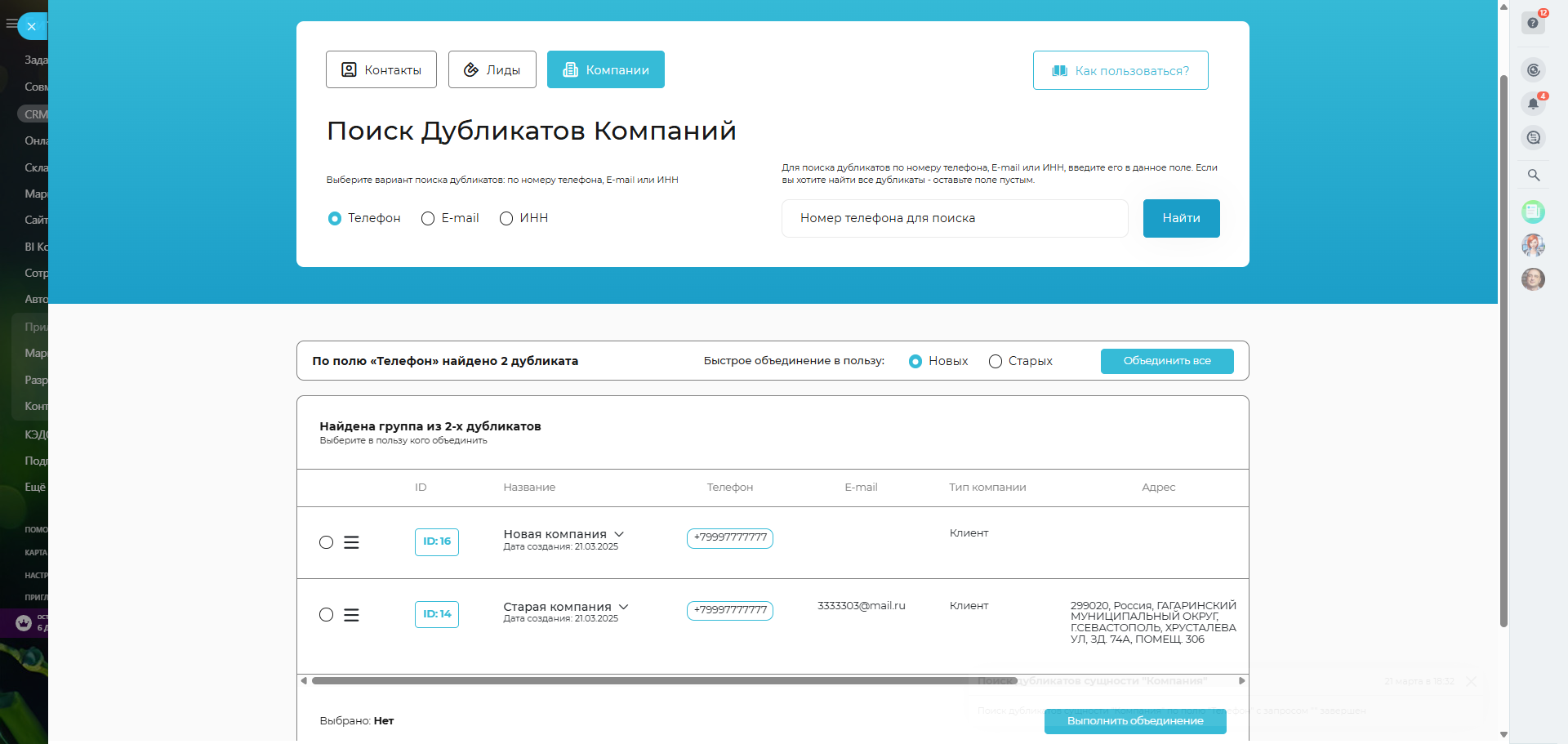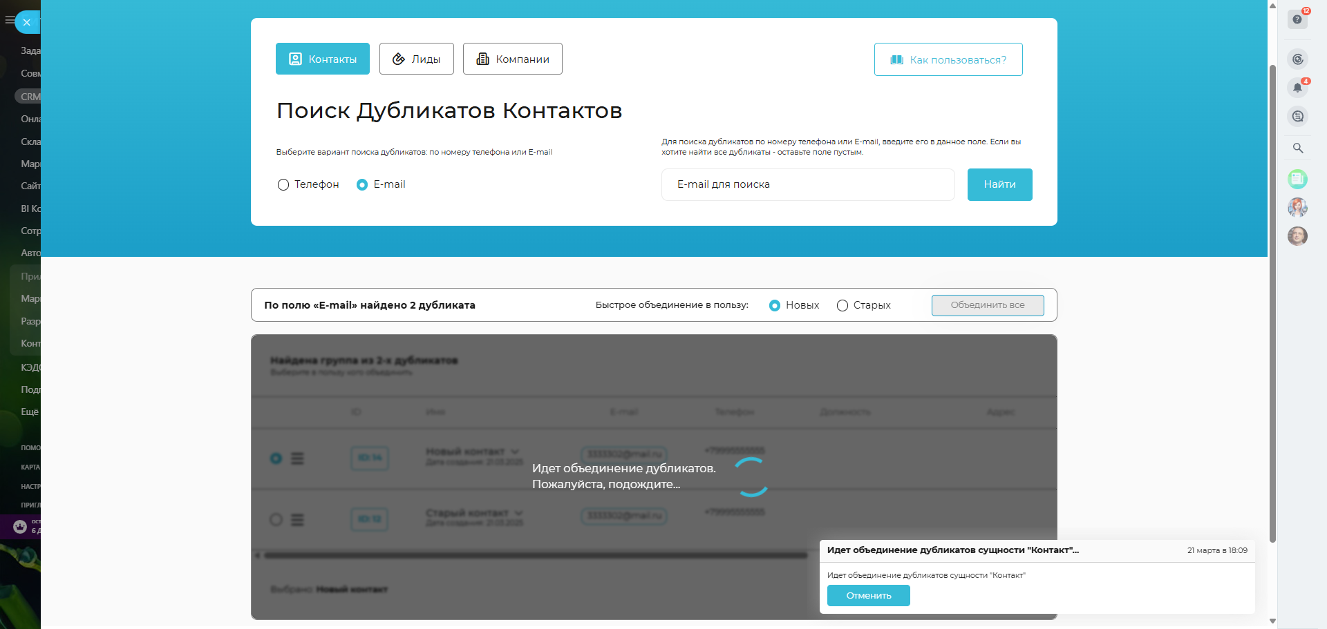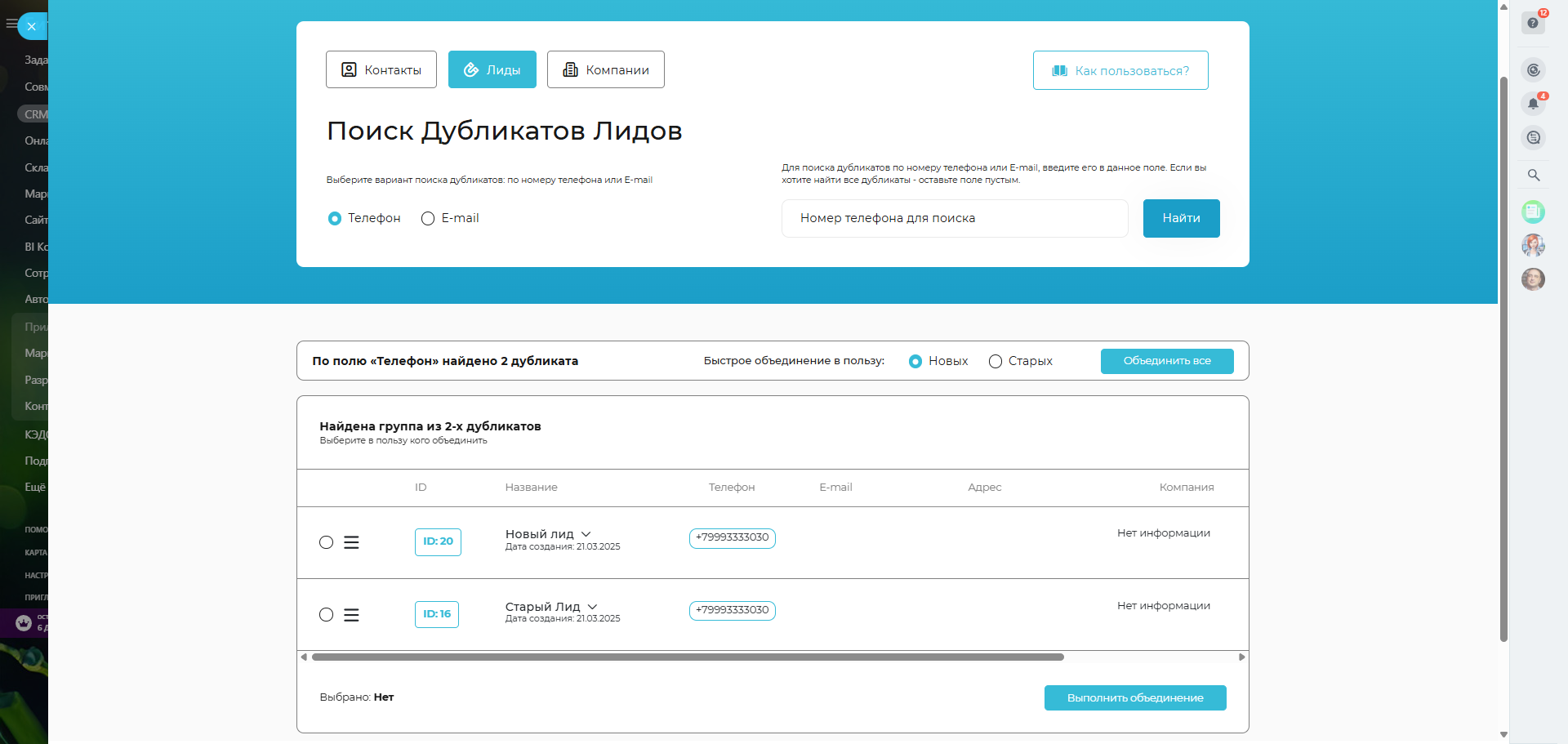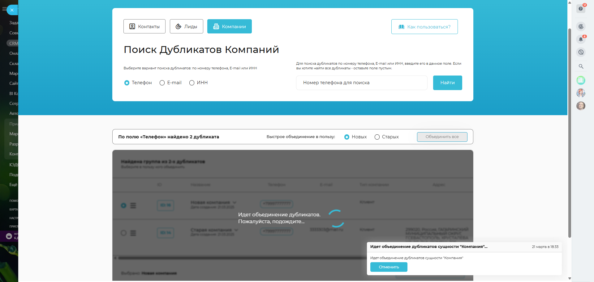 Контроль дублей, автоматическое объединение дубликатов Лидов, Контактов, Компаний по телефону, E-mail, ИНН