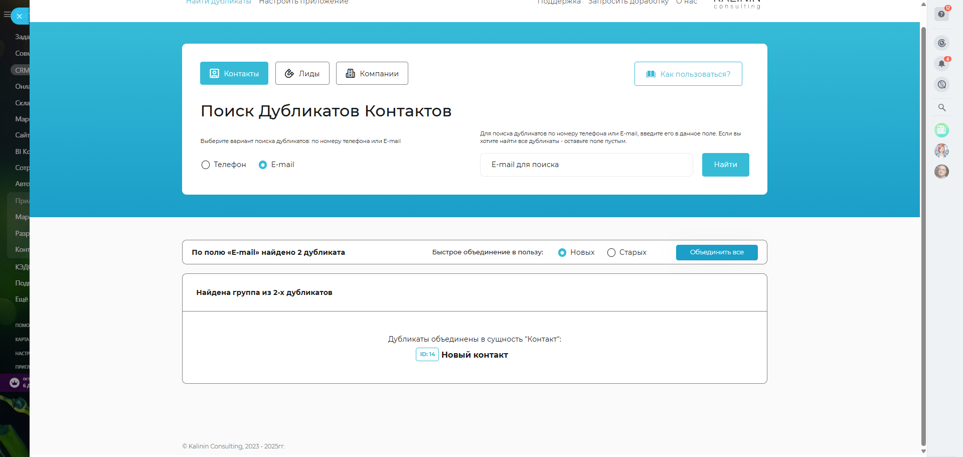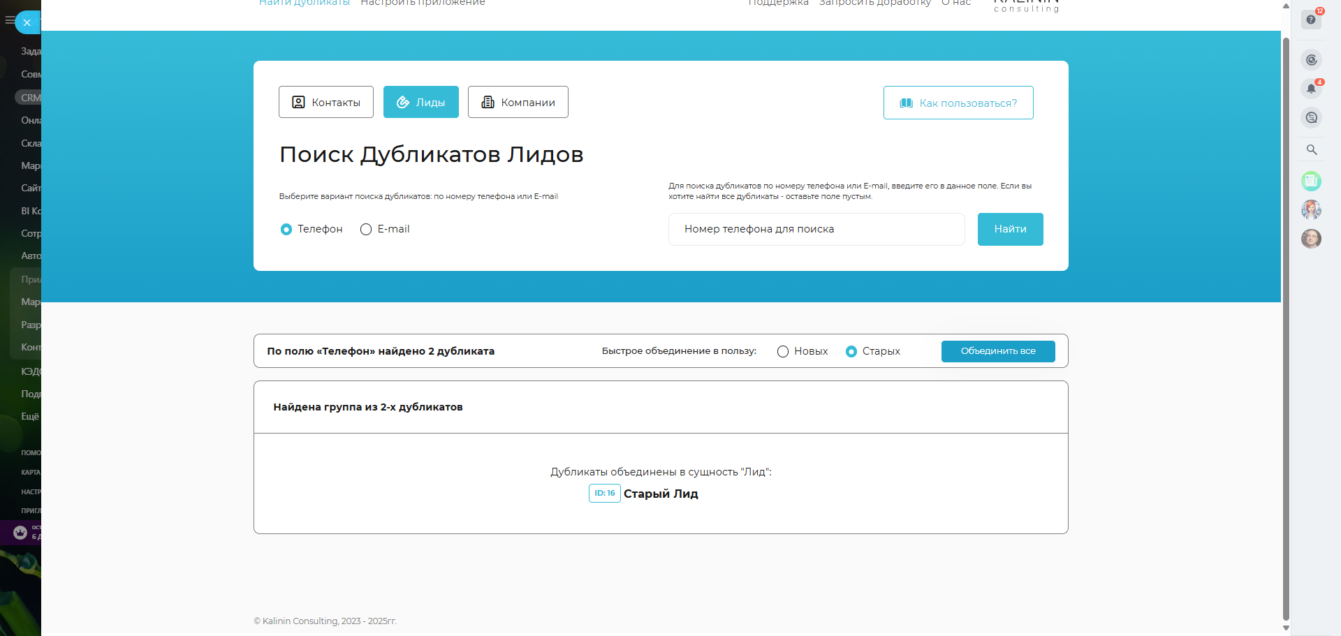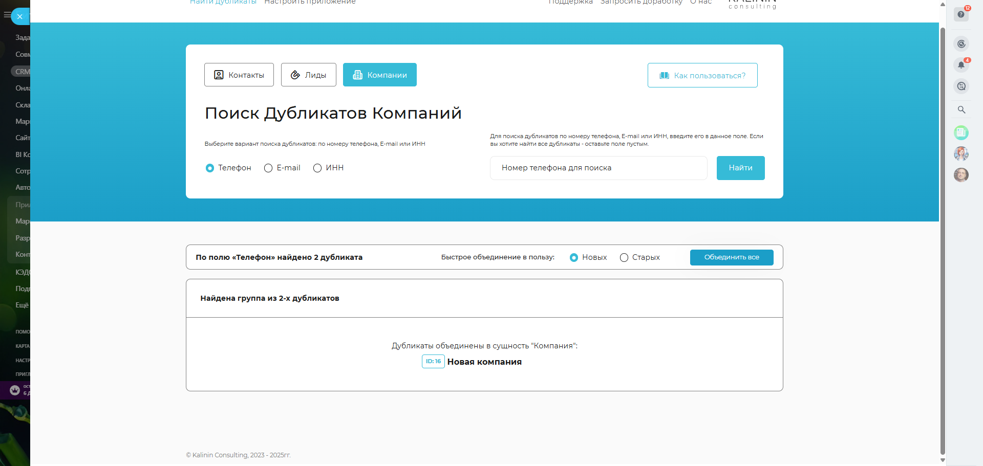 Контроль дублей - приложение для ручного и автоматического поиска и объединения дубликатов Лидов, Контактов, Компаний по номеру телефона, E-mail, ИНН